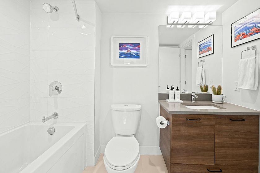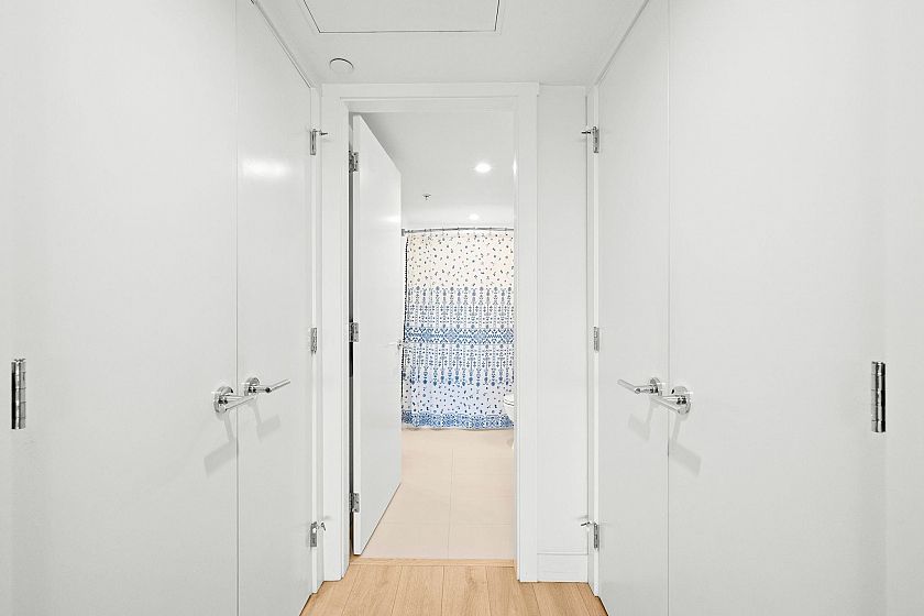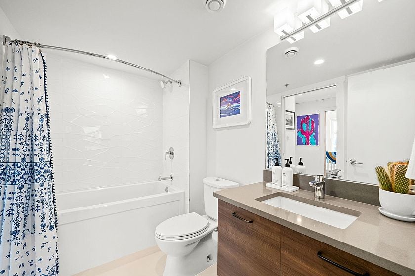 Unique: Corner Unit + Expanded Dining Area + Quiet Side! This exceptionally well-laid-out 1-bed + den, 1-bath home offers extra space and an extra sense of openness. This corner unit offers additional eastern exposure, flooding the home with natural light. Built by Mountain Creations and designed by Georgie Award–winning Eliza Sukava, the north-facing layout features a modern kitchen, premium finishes, and large windows with mountain outlooks. The original owners have cared for this unit meticulously - this home shows like new. The spacious bedroom fits a king-size bed, plus a large covered balcony, 1 parking, and 1 storage. Steps to trails, shops, cafés, Rec. Centre, daycares, and minutes to Lower Lonsdale, Deep Cove, Seymour, and Highway 1.