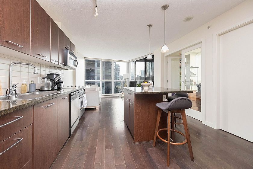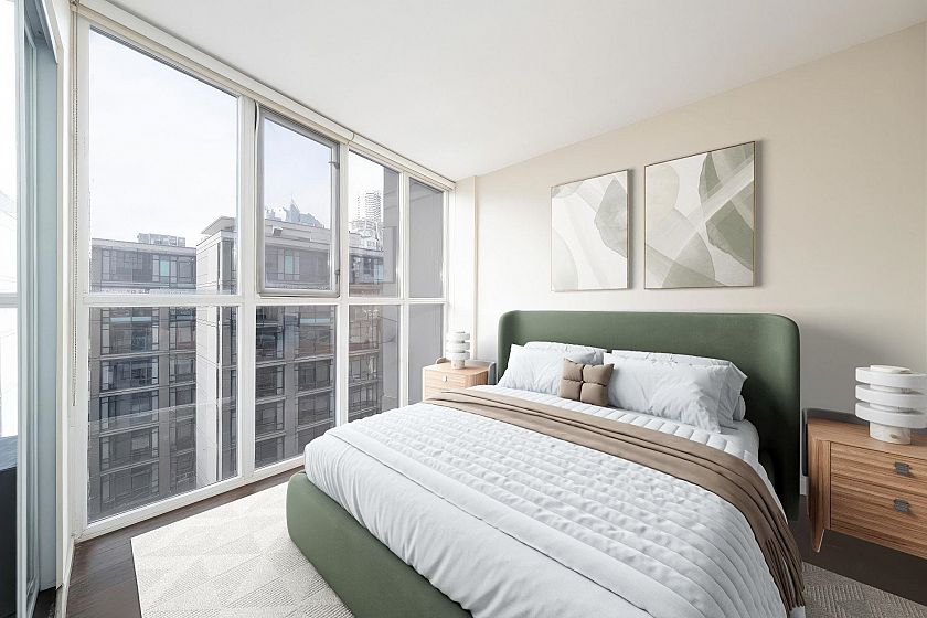 Live at the centre of it all at Brava 2. This SW facing 1 bedroom + den home offers a bright, functional layout with hardwood flooring and a balcony with BBQ allowance. The spacious den with floor-to-ceiling windows is ideal as a home office. Features include in-suite storage with custom shelving, an additional storage locker, and a parking stall conveniently located steps from the elevator. Enjoy first-class amenities: Outdoor pool, hot tub, sauna, steam room, gym, billiards, party and media rooms, children's play areas, and 24-hour concierge. Steps to Yaletown dining, Robson Street shopping, the seawall, Skytrain and cafes. Tenanted month-to-month.