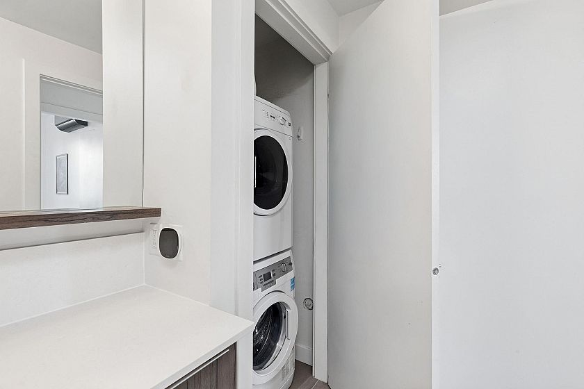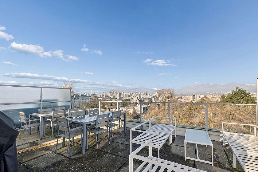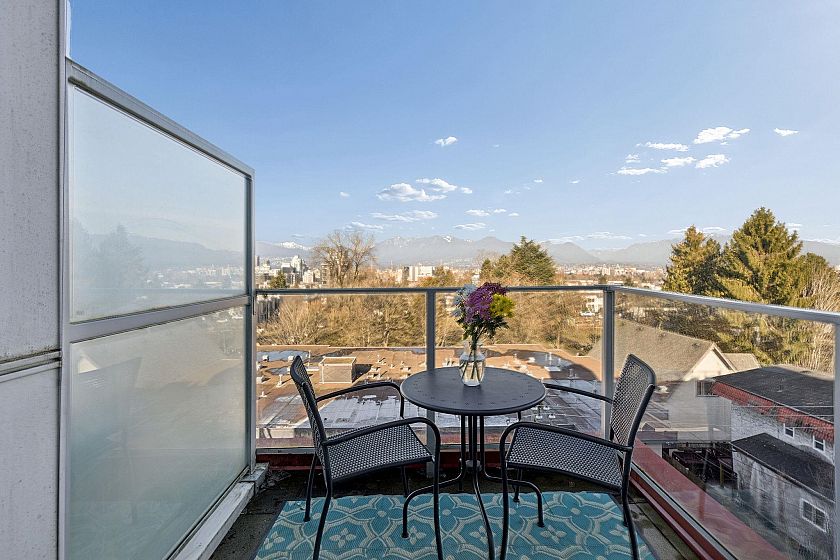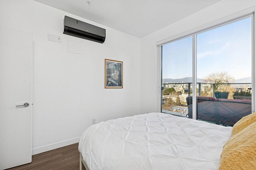 Stunning Penthouse with a massive private patio and incredible unobstructed mountain + skyline views from every room! This bright and airy, north facing, 1 Bedroom + Den on the quiet side features an open plan with 9'0 ceilings, floor to ceiling windows, a modern kitchen with integrated s/s Milano + Blomberg apps + gas range, A/C, in-suite laundry, storage, and parking with its own EV charger. Amenities include a rooftop patio complete with outdoor dining, bbq, lounge, gaming areas, and bike room. Pets and Rentals welcome. Synchro by Bold is a boutique development in the heart of Mount Pleasant with a 96 Walk Score, 94 Bike Score, and Broadway Subway Line. This is a very rare home - not to be missed!