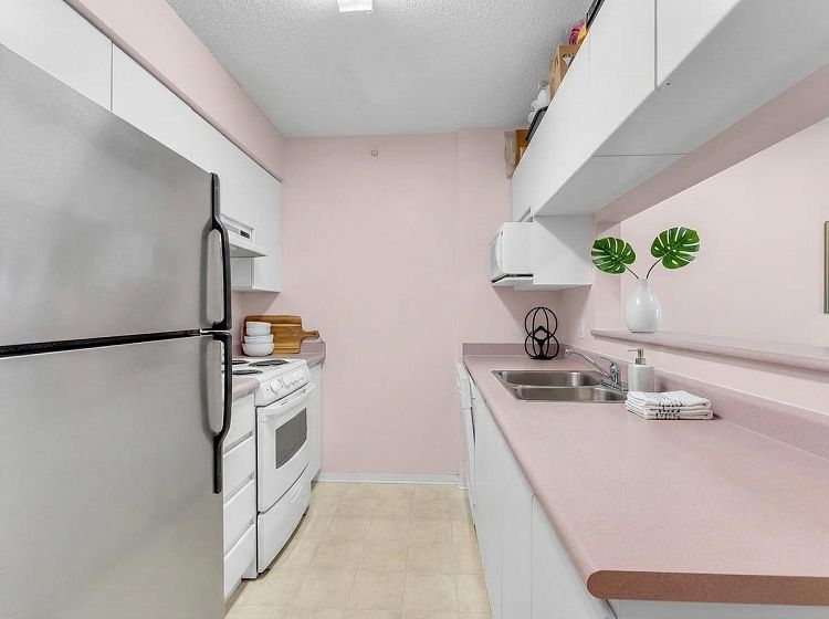 An exceptional opportunity at Regent Court, steps to Joyce-Collingwood Skytrain. This bright upper-level 1 bedroom, 1 bathroom residence offers a thoughtfully designed open layout with nearly 520 sq ft of efficient living in a solid concrete building- quiet, private, and built to last. Natural light fills the space, creating a calm, modern atmosphere. Enjoy effortless urban convenience- SkyTrain, shops, cafés, and parks just steps from your door, while still being tucked into a family-oriented, walkable Vancouver neighbourhood. Rentals allowed, making this a rare find for investors, first-time buyers, or downsizers seeking long-term value in a transit-connected location. And the already low strata fee includes Hot Water. Virtually staged inspiration for your home in the heart of Vancouver!