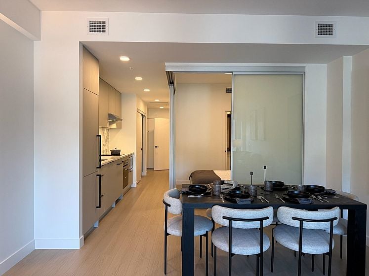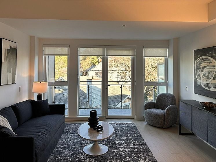 New one-bedroom offering quiet, design-forward living in a Lower Lonsdale, mixed-use building. Northern exposure with floor-to-ceiling windows brings natural light, while concrete construction provides excellent sound separation. Thoughtful layout with comfortable living/dining and generous balcony with mountain views. Refined kitchen with integrated Fisher/Paykel appliances & quartz counters. Queen-sized bedroom with walk-in closet. Spacious bathroom finished with large-format tile and quality fixtures. A/C and move-in ready. Extensive amenities include: landscaped rooftop with gardens, BBQs, & lounge areas. Co-working/lounge spaces at grade. 1 parking stall with EV charging available as an upgrade, & 1 storage locker. Short walk to Esplanade, Shipyards, SeaBus, shops, and cafés! (+GST)