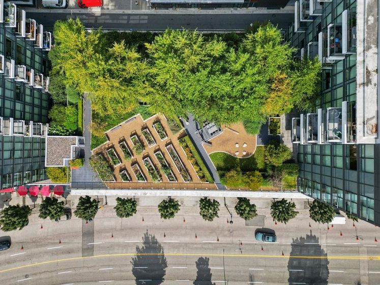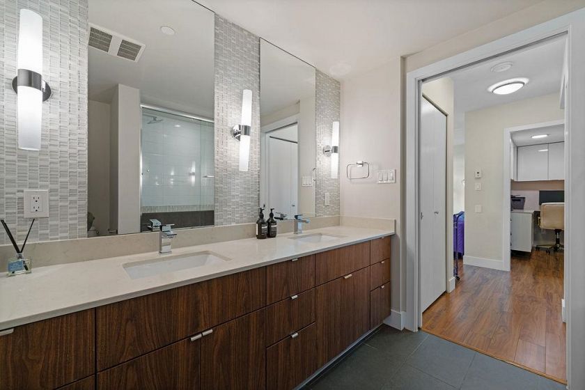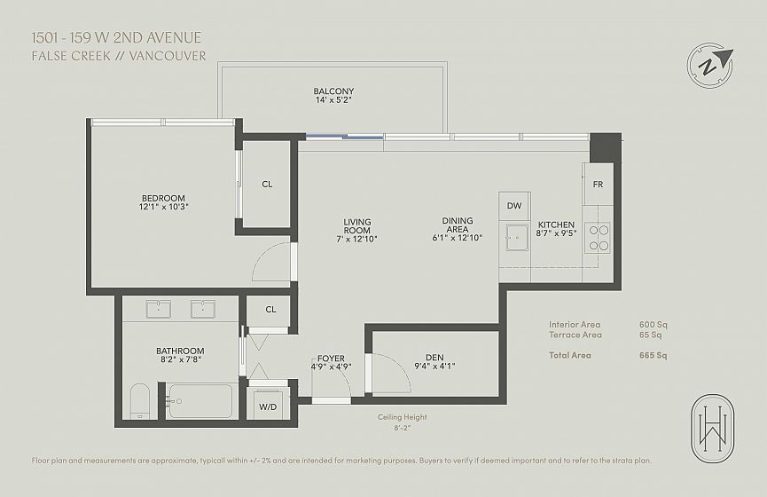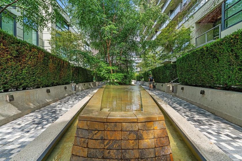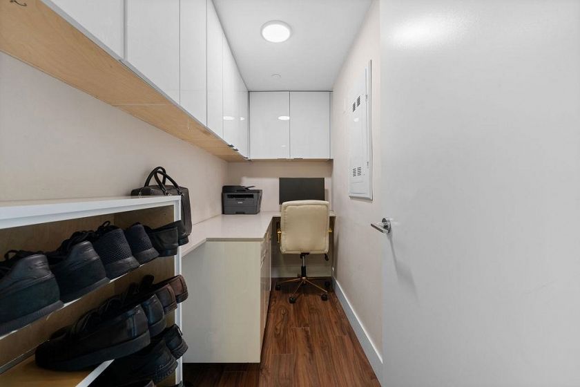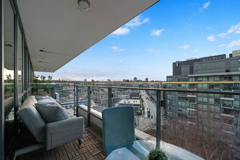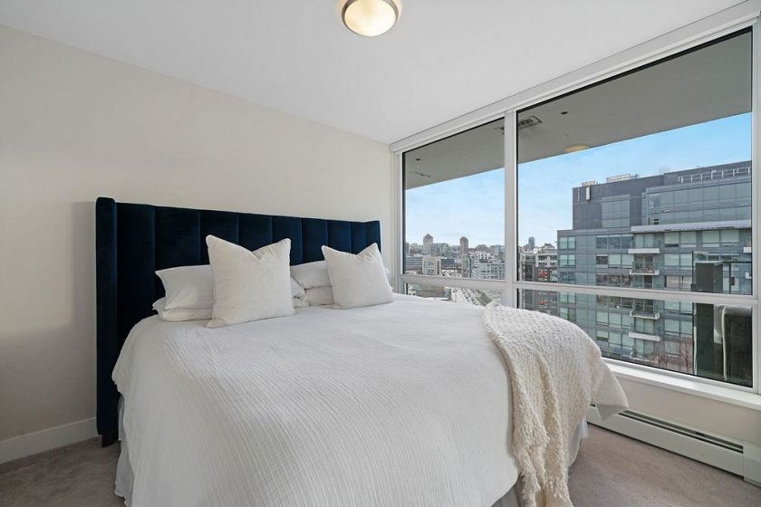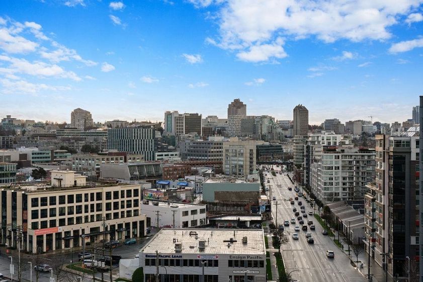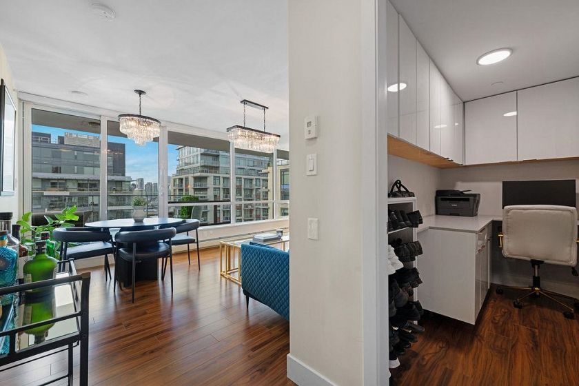 Rarely available high-floor home with a unique wide layout and a full wall of windows spanning the bedroom, living area, and kitchen, creating an open and airy feel. Located in renowned Tower Green in Olympic Village, this bright floorplan features elegant finishings and thoughtful owner upgrades throughout. The large bathroom includes a long countertop, double sinks, and a separate bath and shower. New bedroom carpet. Enjoy a spacious balcony with wood tile, full-size washer and dryer, and a flex room ideal for a home office. Exceptional amenities include a large gym, meeting room, rooftop patio, media room, and clubhouse. One full-size parking stall with EV plug and storage (6x4x7) included. Steps to the seawall and SkyTrain for the best of Vancouver living. 2 dogs or 2 cats allowed.