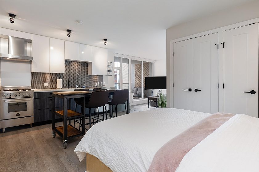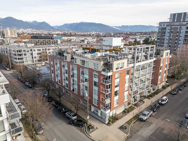 Welcome to The Wohlsein, concrete mid-rise building nestled in the heart of Mount Pleasant. This bright & spacious open concept junior 1 bed is centrally located just steps from SkyTrain, parks, shopping, schools, trendy restaurants & breweries yet it is situated off the busy roads and in a nice inner street. This home features a large balcony with incredible city and mountain views, Murphy bed, high quality stainless steel appliances & lots of storage space. Fantastic amenities include gym, artists workshop, art gallery, social/amenity room, bicycle storage room & a rooftop patio with stunning views. Comes with a large storage locker. Pets and rentals allowed! Airbnb allowed up to 120 days in a calendar year. A MUST SEE!