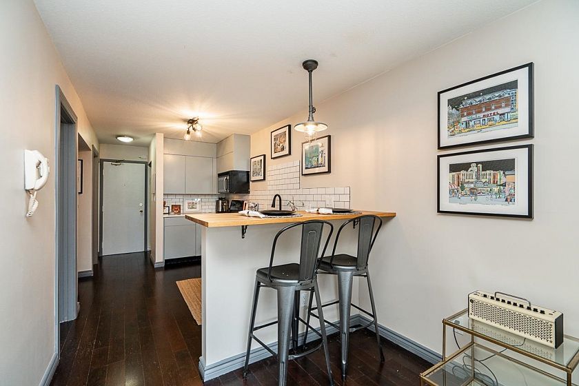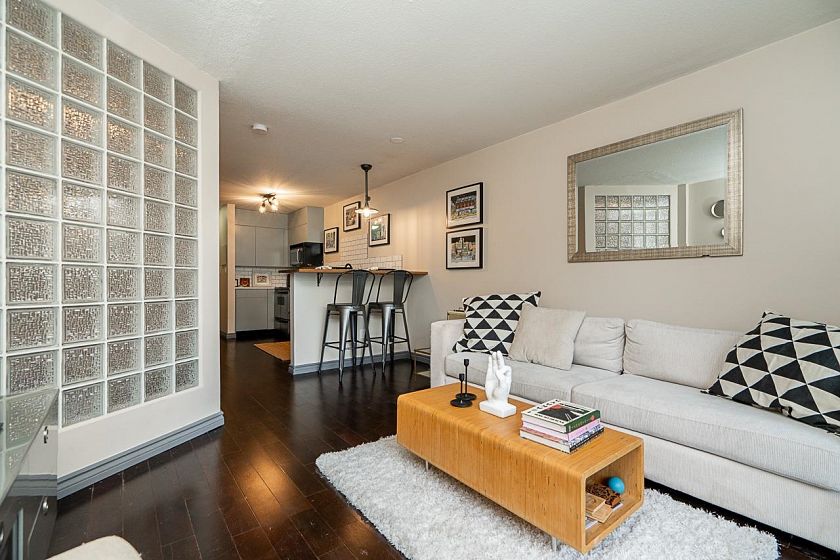 Welcome to this great 1 bed 1 bath Nicely updated Fully rainscreened perfect for entertaing unit. S/S appliances, New quartz counter tops, New backsplash, New Washer/Dryer, Newly painted, Walk in closet, office space and last but not least, almost 250sqft of private outdoor space. Enjoy the outdoors all year round with a peekaboo view of the ocean. Rainscreened in 2004 (Hardi Plank and Vinyl) this building is in great shape. Situated on a peaceful quiet street and in walking distance of Restaurants, cafes, shopping and parks. Parking, Storage but No dogs. Don't miss out as this is one of the special ones.