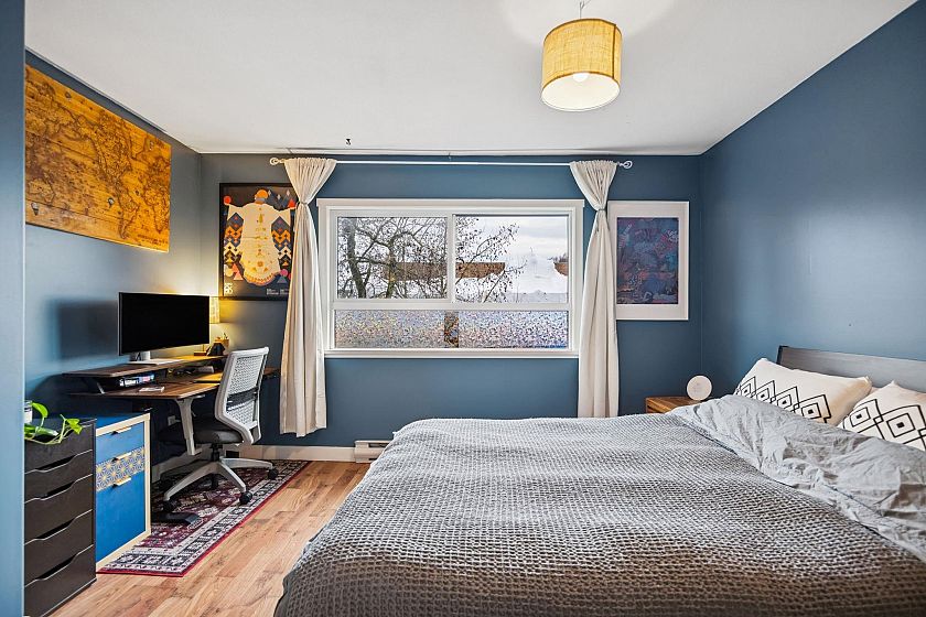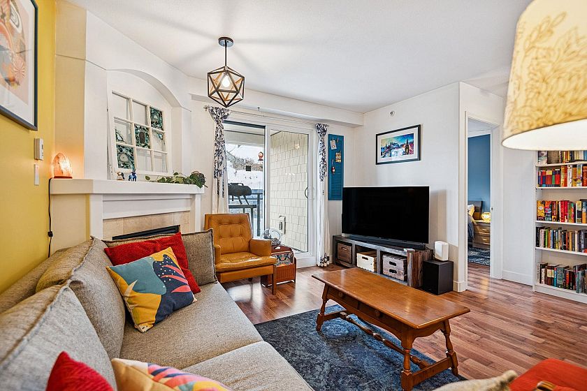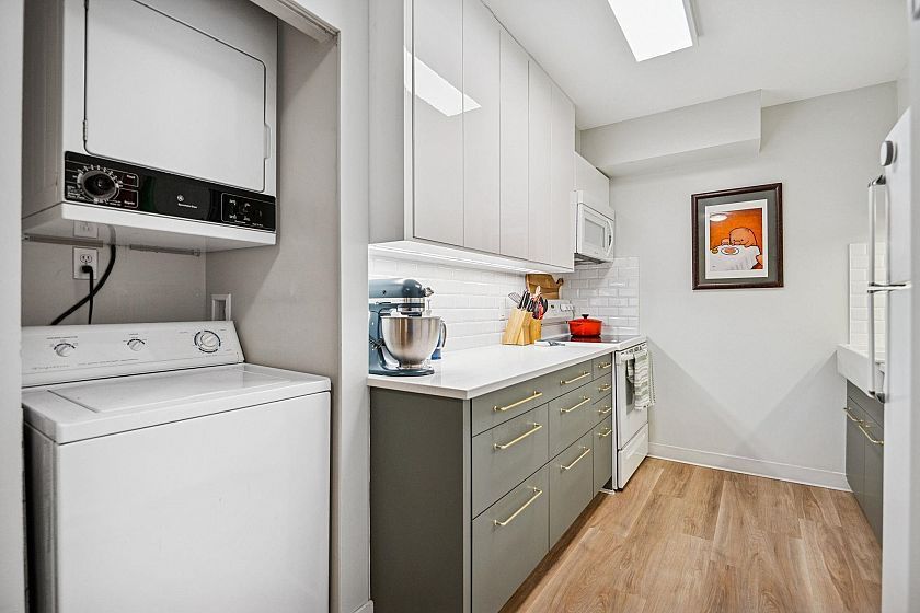 Welcome to the top floor of the 8th Avenue Garden Apartments, featuring a charming peek-a-boo mountain view from the east-facing balcony. This spacious 1-bedroom home offers a contemporary updated kitchen with new flooring, a renovated bathroom, cozy gas fireplace, and in-suite laundry. The well-maintained building has been fully rainscreened with a new roof completed in 2021, along with recent re-piping, new hallway carpets, and fresh paint. Includes two parking stalls, storage locker, and bike room. Prime location close to transit to UBC, shopping, restaurants, and Trout Lake. City sewer upgrades currently in the Nanaimo–East Kamloops neighborhood. Plz park on 7th Ave & walk on the right/west side of Kamloops along the grass to front entrance. Can park on EBroadway on weekends.