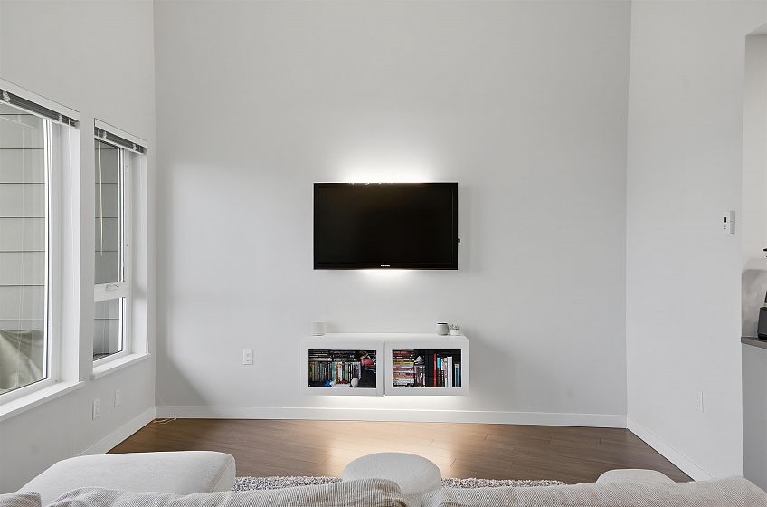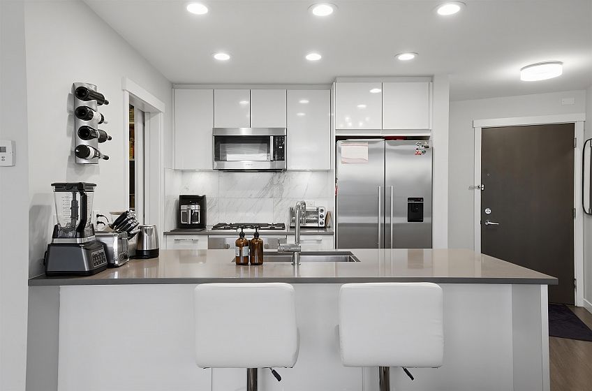 Discover this rare, top-floor southwest-facing home at Rhythm by Polygon, perfectly positioned on the quiet side of the building — not facing Marine Drive. Flooded with natural light, this beautifully designed suite features soaring ceilings, in-floor radiant heating, and a gourmet kitchen equipped with a gas cooktop, Bosch oven and dishwasher, Fisher & Paykel fridge, and elegant quartz countertops. A standout feature is the in-suite storage room, offering the flexibility to use it as a den, office, or additional storage space. Step outside to a spacious private balcony, ideal for relaxing or entertaining. Residents enjoy access to exceptional amenities, including a stylish clubhouse, fully equipped gym, garden courtyard, bike room, and pet wash station.