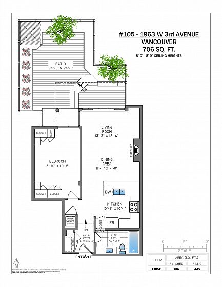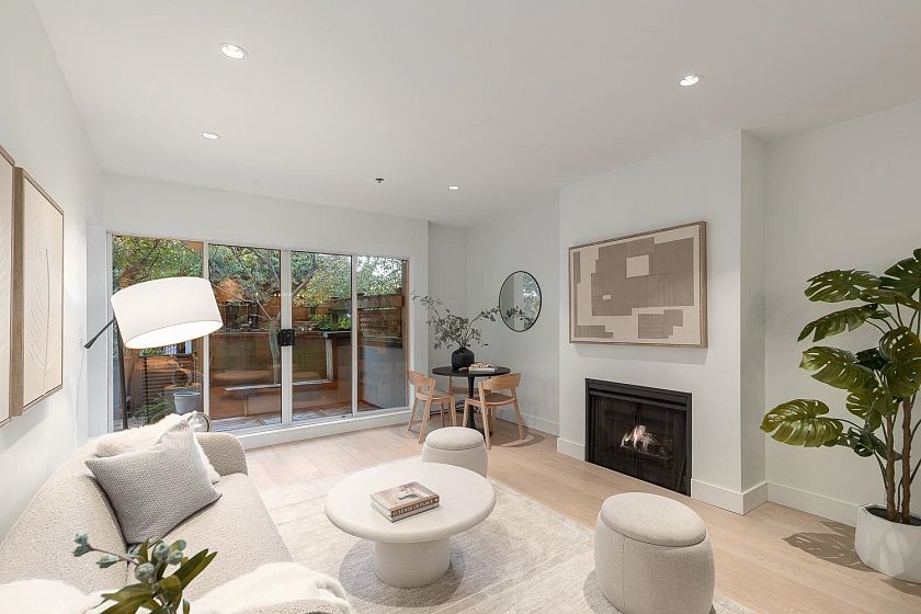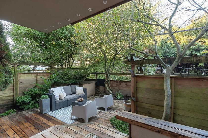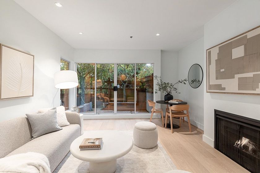Prime North of 4th location! Beautifully renovated 706 sq ft one bedroom home offering exceptional indoor-outdoor living. Enjoy a private 445 sq ft fully fenced outdoor space with garden beds, mature greenery, cedar decking, and a large covered area-ideal for relaxing, entertaining or pets. Interior highlights include over-height ceilings, wide-plank oak hardwood and custom lighting & built-ins throughout. Gorgeous contemporary kitchen offers quartz counters with bar seating, ample cabinetry & stainless appliances. Open living and dining areas include a cozy gas fireplace and sliding doors that open to the outdoor oasis. Spacious bedroom has custom built-ins and a nook for a home office. Steps to shopping, cafes, transit and just a few blocks to Kits Beach. 1 parking & 1 locker included.