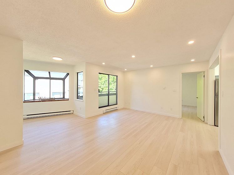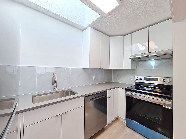 METICULOUSLY UPDATED, TOP FLOOR, QUIET, CORNER 1-bedroom unit located in the treelined MARPOLE neighborhood! This generously sized residence is conveniently situated. Inside, discover BRAND NEW laminate flooring complemented by elegant large-format tiles in the bathroom. HUGE outdoor balcony! The kitchen features a SKYLIGHT and boasts BRAND NEW stainless steel appliances, BRAND NEW soft-closing cabinet doors, and BRAND NEW beautiful quartz countertops, offering both style and functionality. Includes 1 parking (gated) and 1 storage locker!