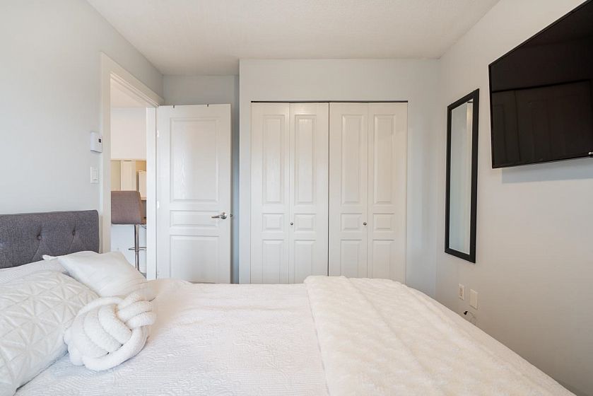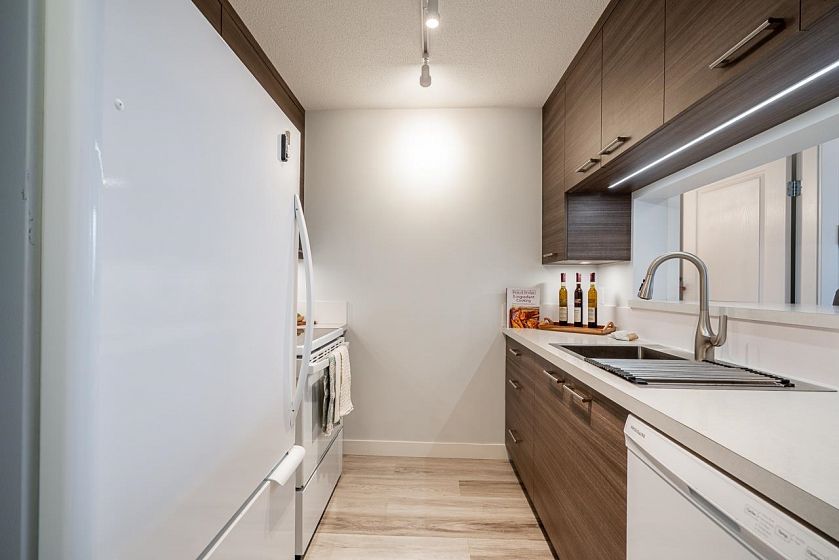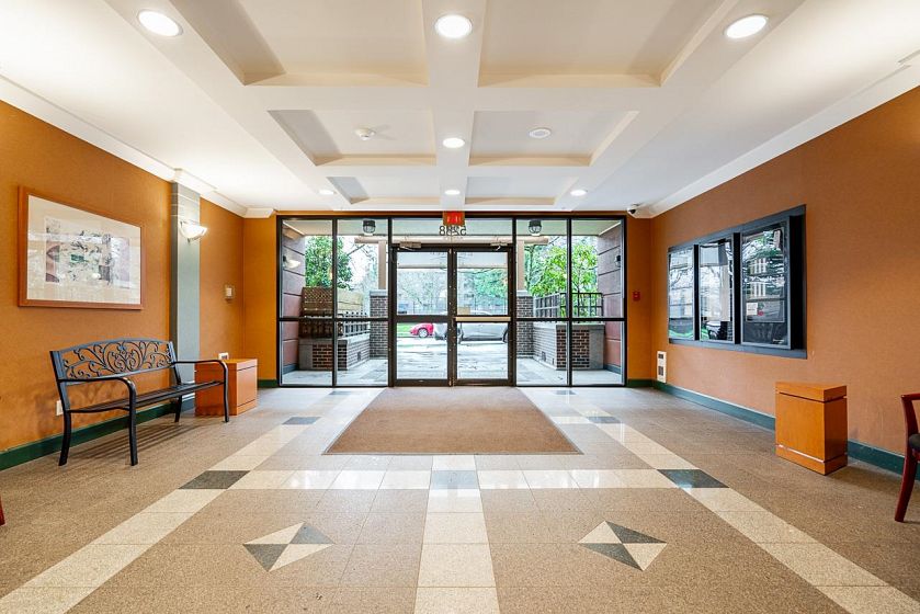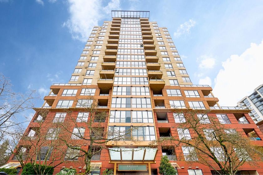 Welcome to Emerald Park Place. This bright and modern 1 bedroom plus den home offers an open-concept layout with updated kitchen cabinetry, newer stove, dishwasher, and microwave, along with upgraded vinyl flooring featuring enhanced soundproofing. The unit is exceptionally quiet and well insulated. The den includes a built-in desk, ideal for working from home, and the living space is complemented by heat-resistant blinds and a built-in A/C mount for year-round comfort. Enjoy stunning, unobstructed 180° city and mountain views that flood the home with natural light. Additional features include in-suite laundry, 1 parking stall, and access to a fully equipped gym. The building has a newer elevator and is located just steps from Joyce SkyTrain, restaurants, parks, and nearby sports courts.