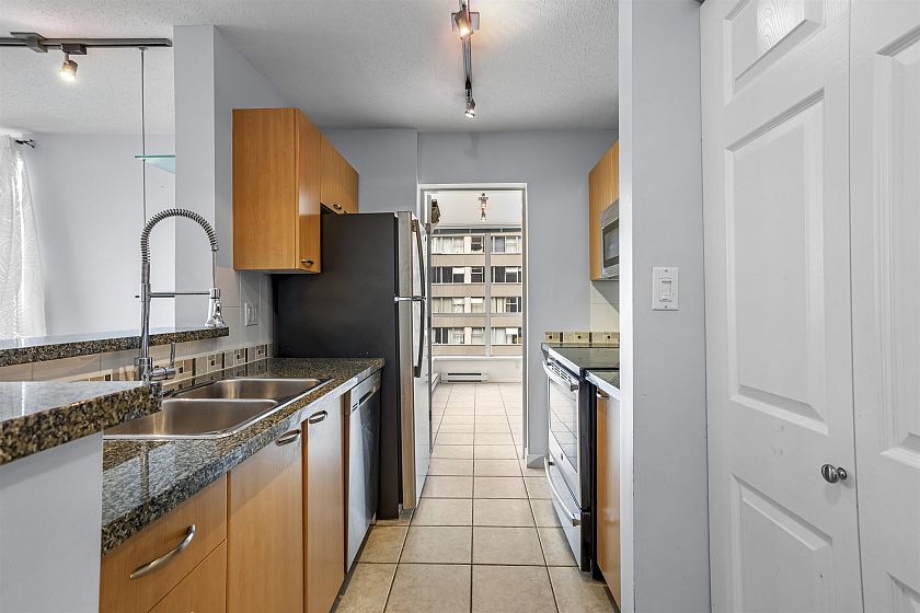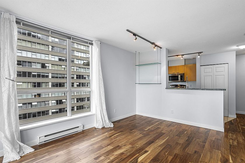 Welcome to The George. This bright and thoughtfully designed 1 bedroom + den + solarium home offering over 680 sq ft, one of the larger layouts in this well-run building. Features include stainless steel appliances, quartz countertops, and engineered hardwood flooring throughout. The smart floor plan provides excellent flexibility with two separate workspaces — a private den ideal for a home office and a spacious solarium perfect for a second office, reading nook, or guest area. Enjoy pleasant West End and city outlooks with a peek-a-boo view toward English Bay. Unbeatable location just steps to the seawall, Stanley Park, Robson & Denman, and Coal Harbour. Rentals allowed, no pets. Includes 1 parking and storage.