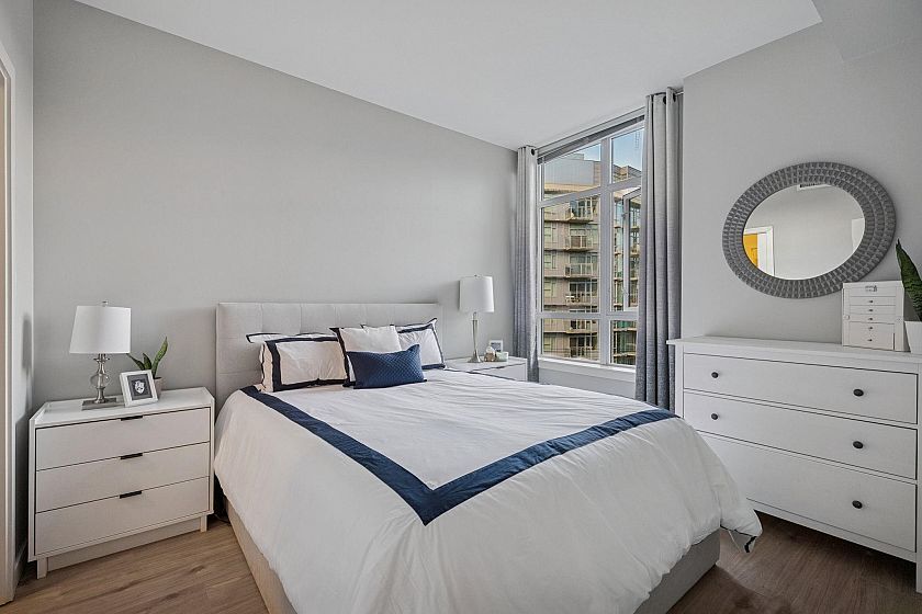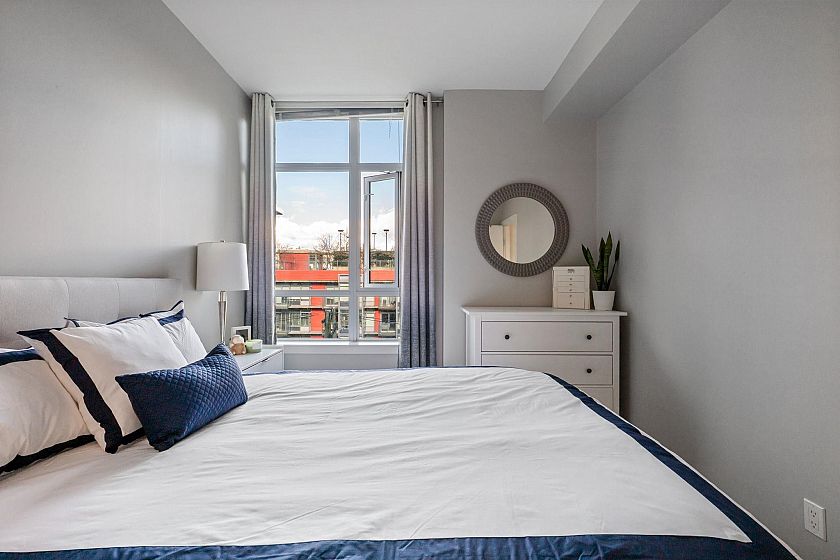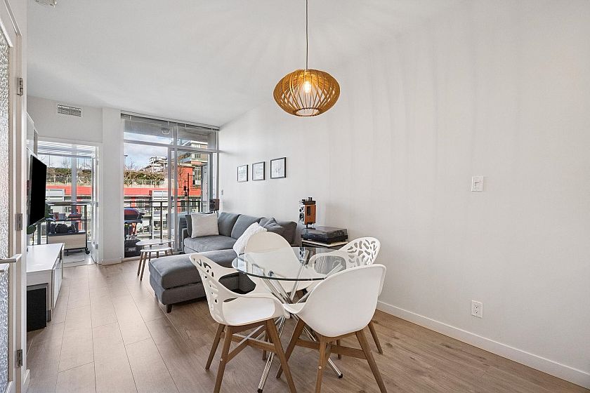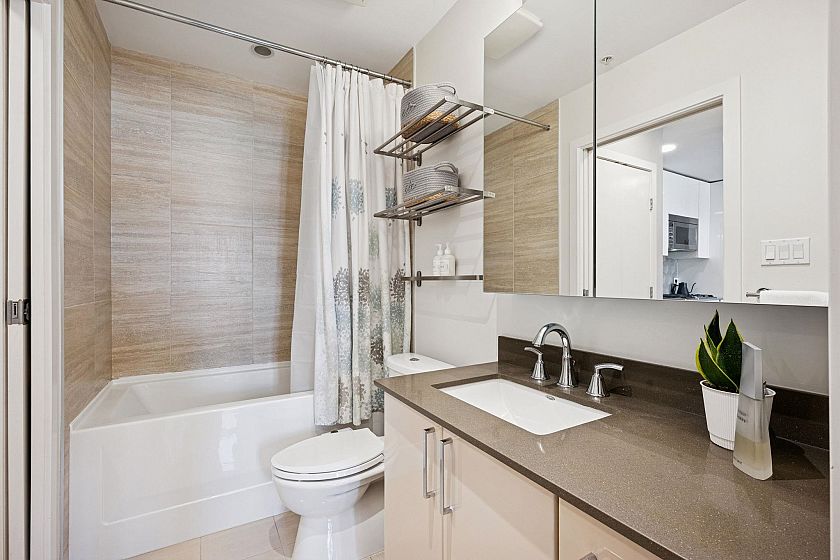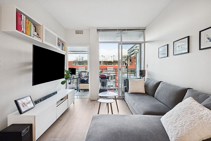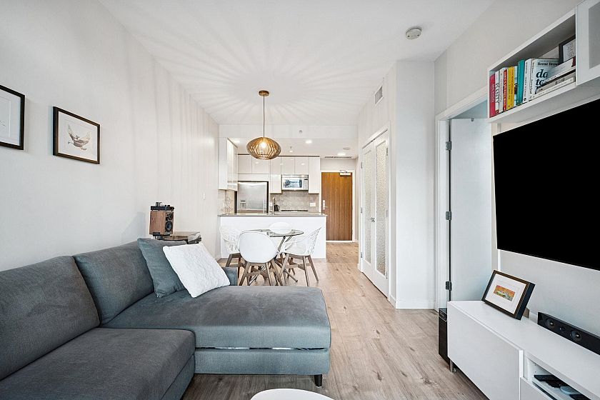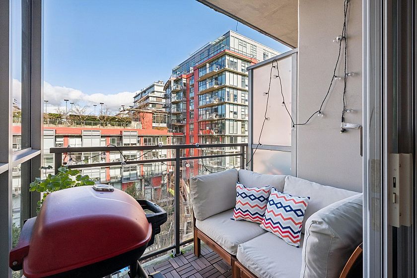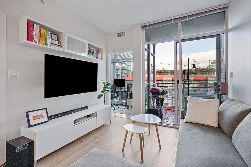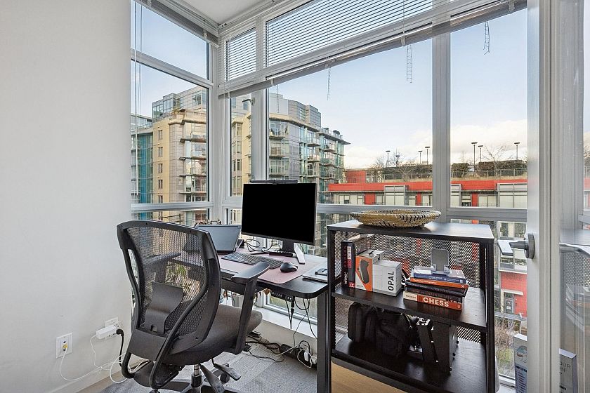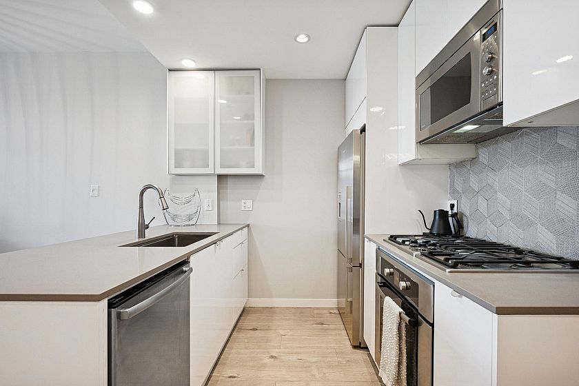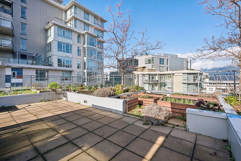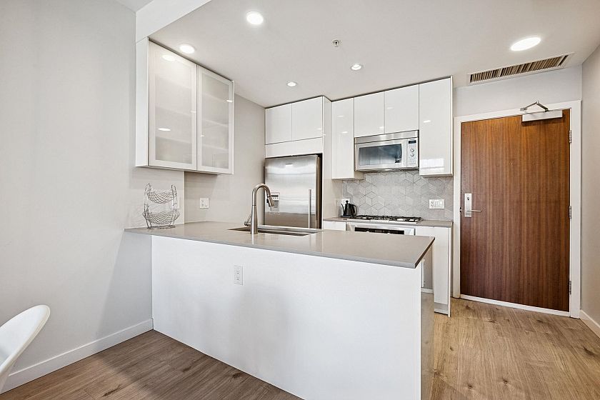Immaculate & RENOVATED 1 BED + DEN + FLEX at Pinnacle Living. Located on the quiet side of the building, the home features a gourmet kitchen with high-gloss cabinetry, task lighting, SS appls & gas cooktop for effortless meal prep. Relax in the spacious bedrm w/walk-thru closet, or unwind in the indulgent bath w/plenty of storage. Large DEN has full-height windows, perfect for work from home and the FLEX can be a pantry, 2nd office or storage. Covered balcony for year round BBQs & lounging, while high ceilings & large windows fill the home with soft light. Contemporary lighting, newer flooring, air con & 1 parking complete the home. Amenities: rooftop terrace, gardens, gym & clubhouse. Steps from the seawall, restaurants, cafes, Skytrain & Cambie Village shopping.
