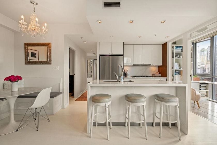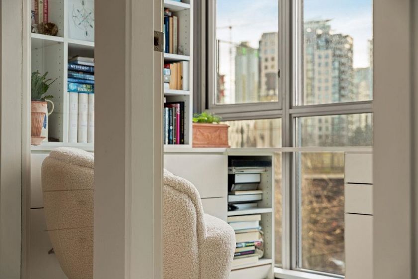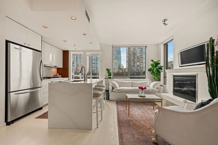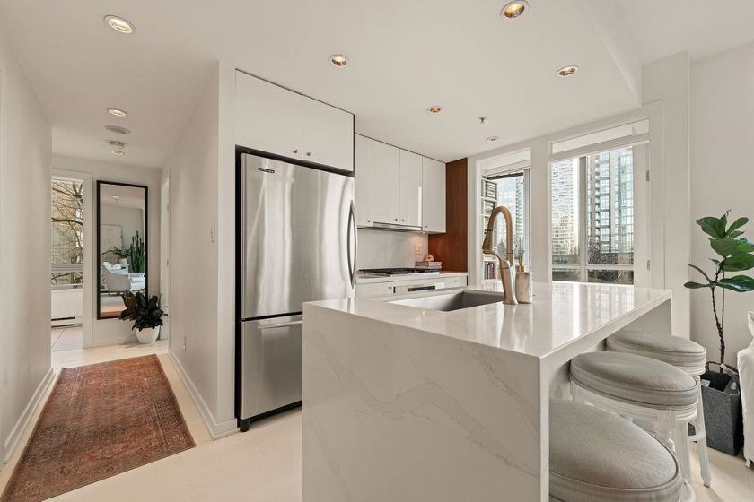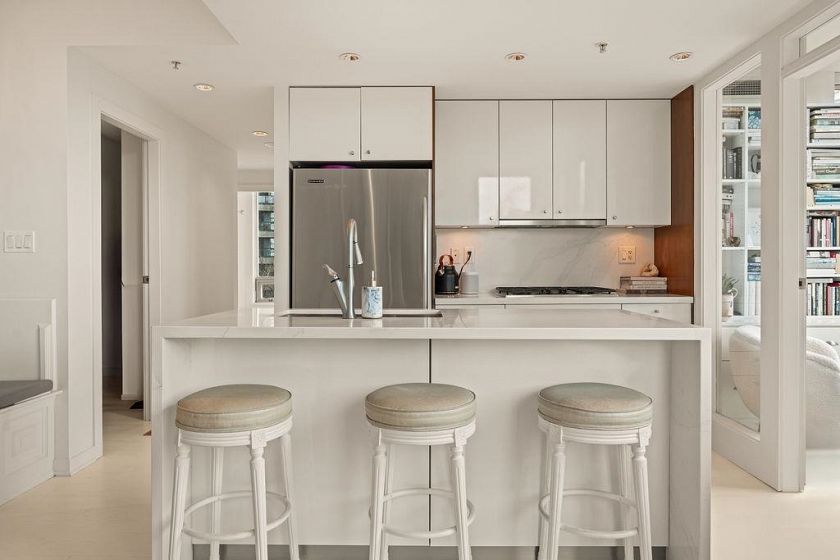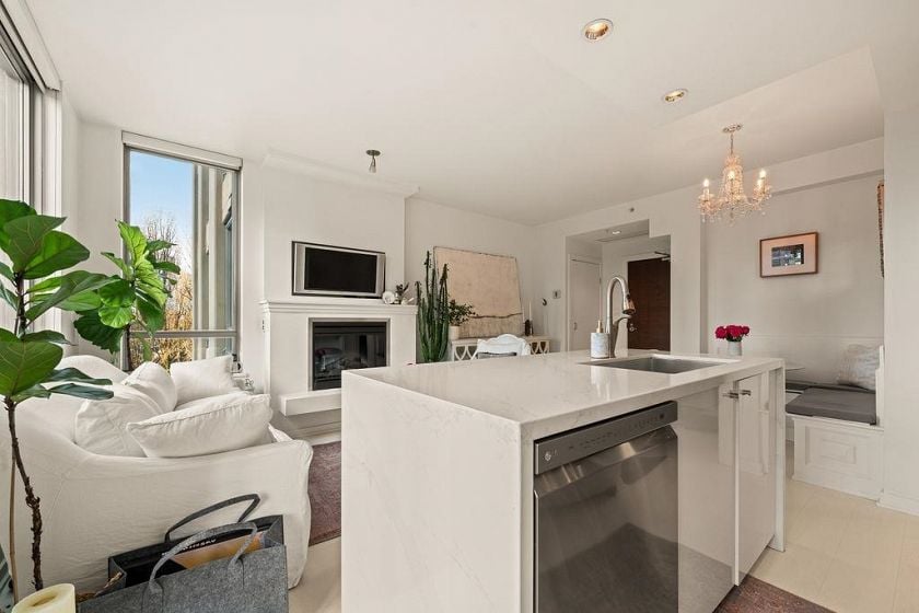 Experience refined coastal living at Alvar, in sought-after BEACH DISTRICT! This beautifully renovated 1 BED + DEN home offers an elegant, open-concept layout in one of the BEST BUILDINGS in the area. Expansive windows flood the space with natural light, complementing the airy 9-foot ceilings and the sophisticated white interior feels warm, welcoming & effortlessly timeless! Storage is abundant with a huge pantry and storage locker. The den/office with built-ins creates the perfect work-from-home retreat. Cozy fireplace anchors the living space, adding charm & comfort. A/C, 1 parking and pet-friendly (2 pets), it's a dream! Building amenities include a BBQ, Gym, Media Room, Hot Tub.Every detail has been carefully curated, resulting in a space that feels elevated, serene, and move-in ready.