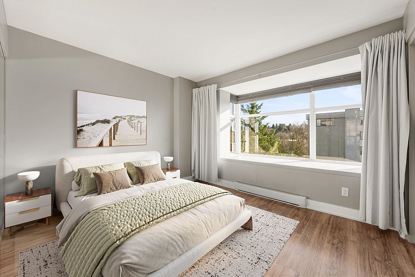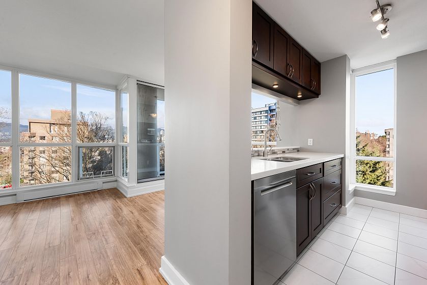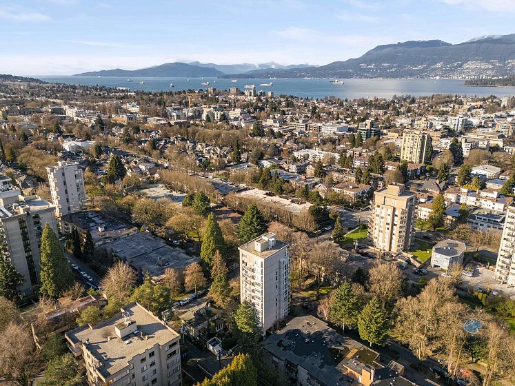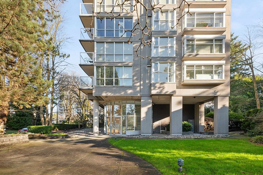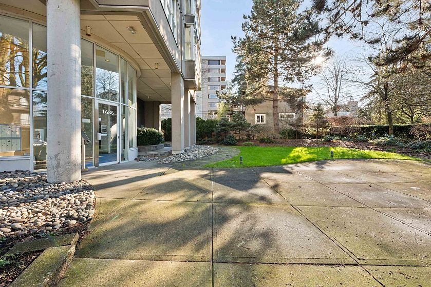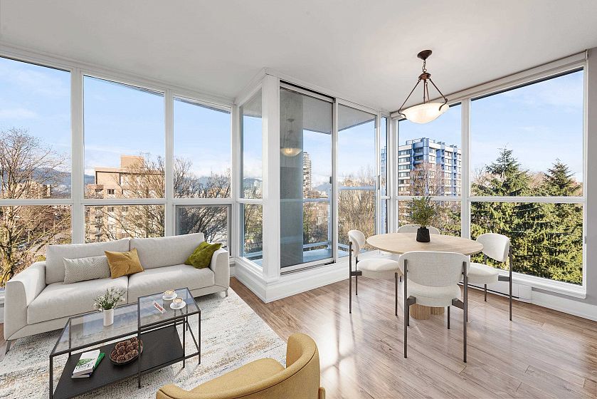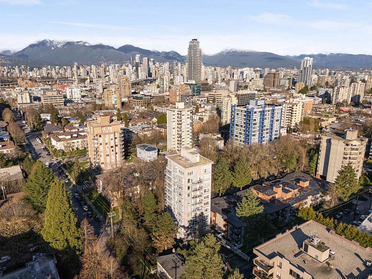Concrete end-unit condo at Dorchester Pines, 686 sF, 1 Bed + Den, sharing the floor with only one other residence. This boutique 11-storey building offers exceptional privacy with just 2 units per floor. Floor-to-ceiling windows on three sides bring in abundant natural light, while the flexible den easily functions as a home office or guest space. Thoughtful layout maximizes every square foot. In-suite laundry & a private balcony complete the home. Dorchester Pines is a well-maintained concrete building on a quiet, tree-lined street, fully rainscreened & repiped, with only 19 residences total. Elevator, bike room, garden space, and wheelchair access. 1 Secured Parking included. Pet and Rental Friendly. Steps to transit, parks, shopping, dining, & the best of Vancouver’s West End lifestyle.