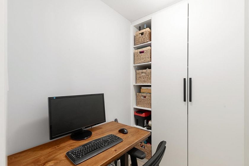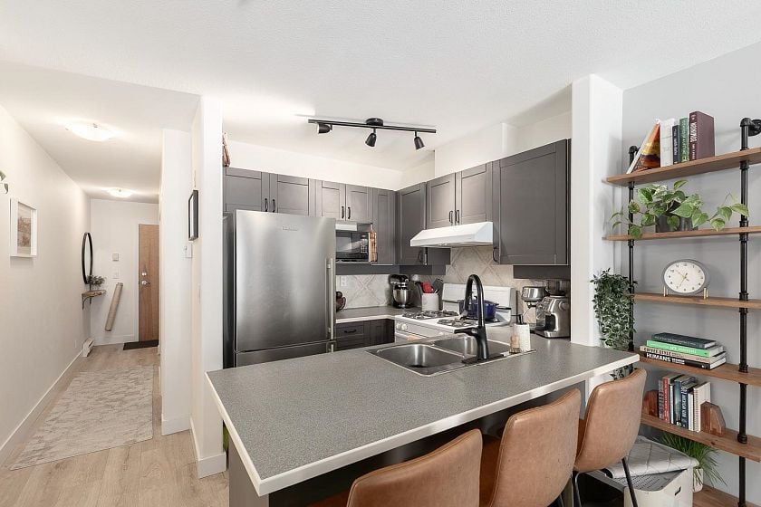 The Treo at Arbutus Walk. TOP FLOOR - 1 bedroom with flex room Wonderful open kitchen, gas range, in-suite laundry all in an efficient floorplan. Enjoy your morning coffee and a sizable east facing balcony. Laminate flooring and a gas fireplace make this unit the perfect cozy home. Amenities include a lounge and a fitness area. Right on the edge of Connaught Park, Shopping & Transit. This home is a walkers paradise and a must see.