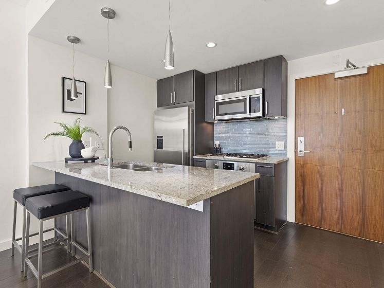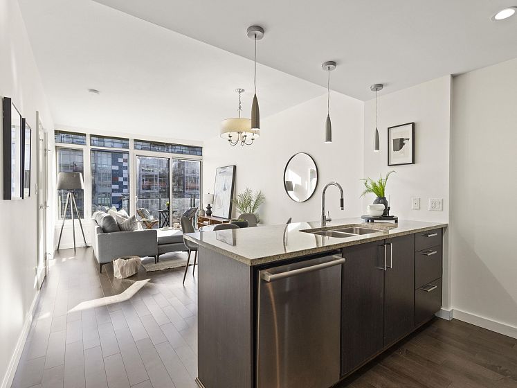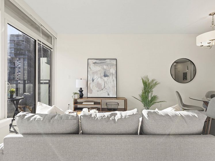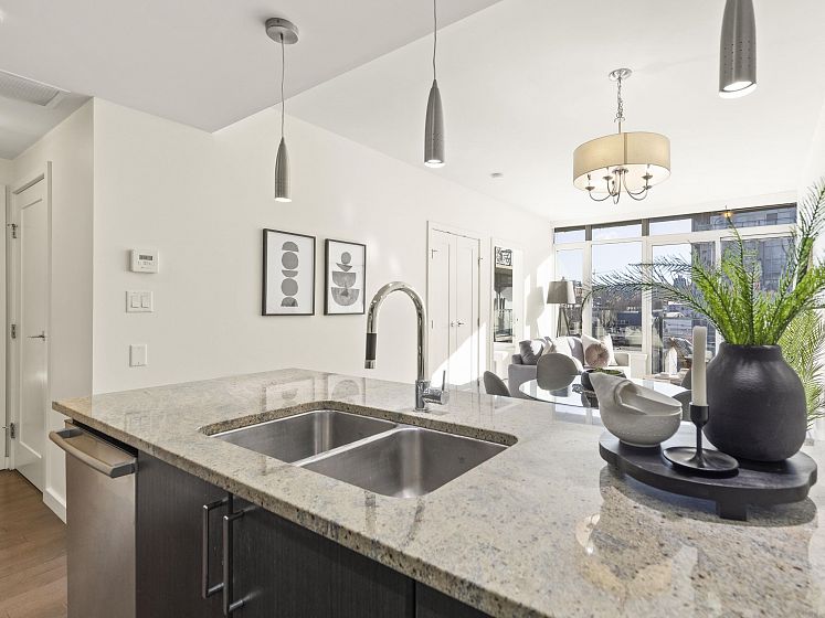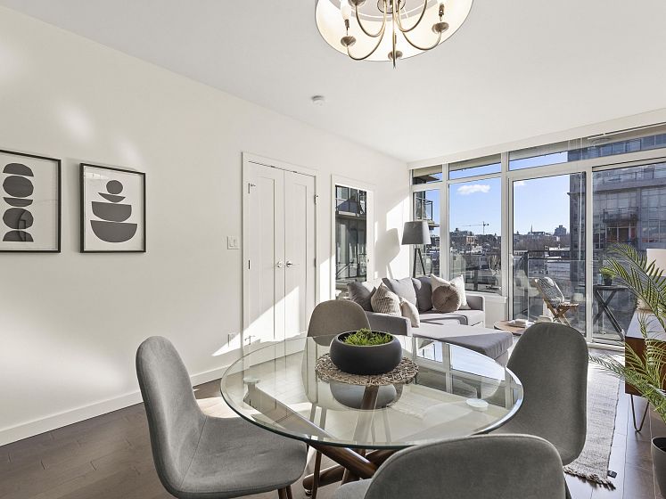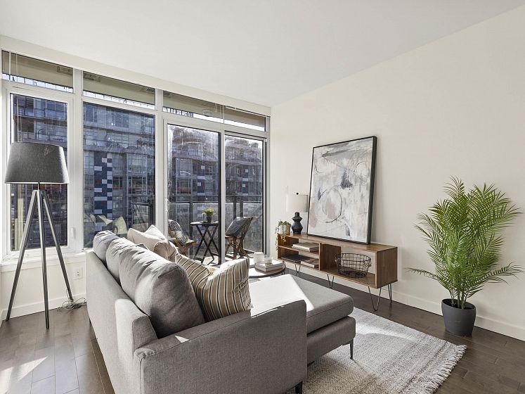 Perfect floor plan for the Olympic Village one bedroom & den home you've been looking for. This layout offers every functional space a home can possess. Full sized appliances in kitchen, ample dining and living room space, well lit den, perfect for a home office, large flex/storage room and a walk in closet. Facing the quiet backside of the building, showered in natural sunlight but cooled by the homes's A/C. The home also includes parking, a storage locker and dedicated bike stall. Prime Olympic Village location steps to the sea wall, restaurants and grocery; a short walk to 2 skytrain options. The One offers an outdoor rooftop pool, fitness centre and party room. This home ticks every box, come see for yourself.