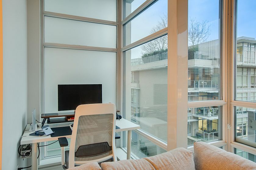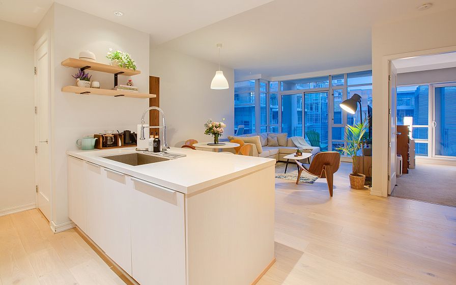 Experience the privilege of living just moments from the world’s longest uninterrupted oceanfront seawall. Perfectly positioned in one of the city’s most sought-after waterfront communities, this extensively refreshed one-bedroom plus den residence offers an exceptional blend of location, lifestyle, and refined interior updates. The bathroom was recently taken to the studs and re done to allow for his and her sinks and a custom tile feature wall. White Oak, wide plank hardwood was just installed throughout to compliment the lite and bright decor. Soaring 9-foot ceilings and floor-to-ceiling windows create an impressive sense of space and natural light, enhancing the home’s open & airy ambiance. Located on the quiet side of the bldg. overlooking the inner courtyard. Resort style amenities.