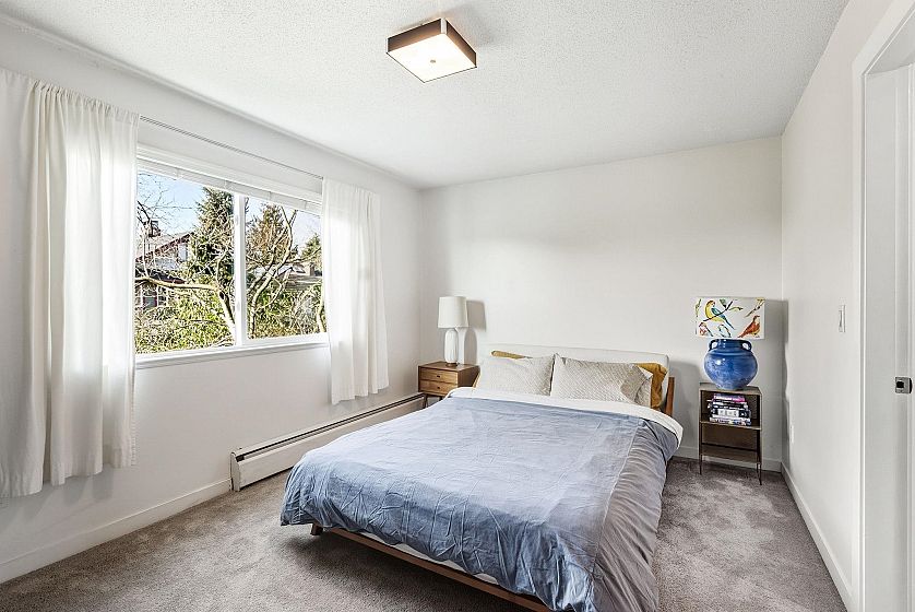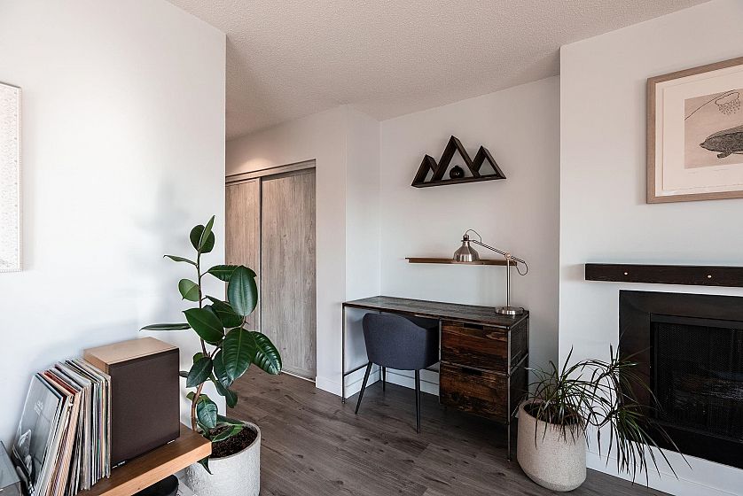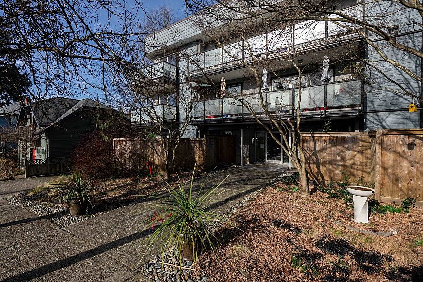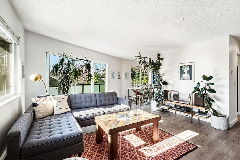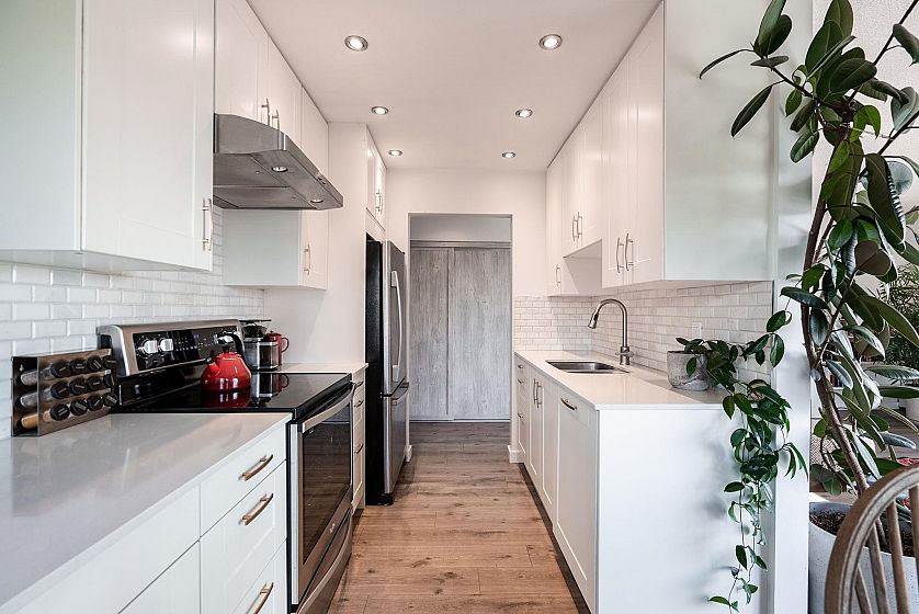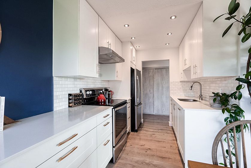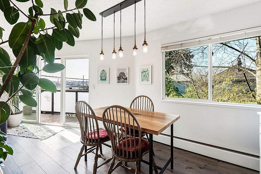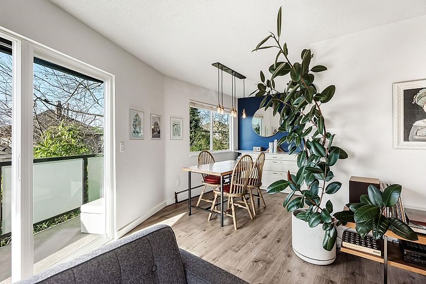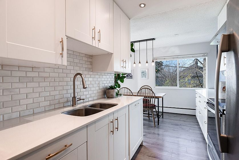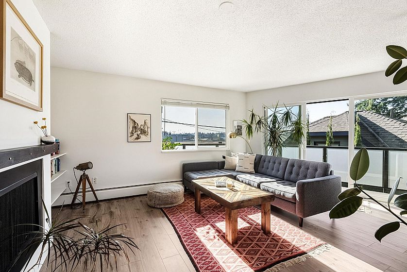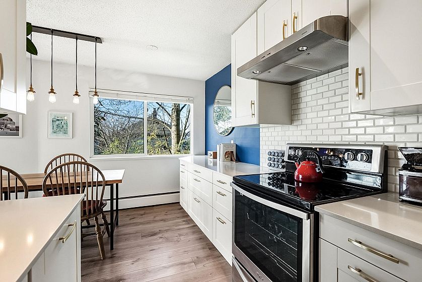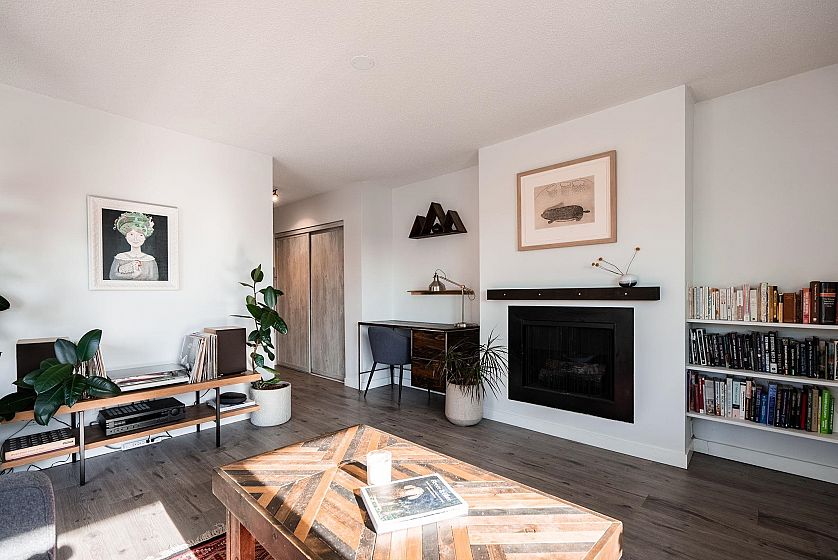 Finally, a home that LIVES as good as it looks. Beautifully renovated corner 1 bed home at Landmark Place just off The Drive! BRIGHT & SPACIOUS w/ south/west exposure, so many windows & a large WRAP-AROUND PATIO perfect for entertaining. Everything feels BIG, from the open living & dining to the HUGE bedroom that easily fits a king. Stunningly updated kitchen w/ shaker cabinetry, quartz counters, subway tile backsplash, brass hardware & S/S appliances. Cozy gas fireplace & modern flooring throughout. Edison pendants & bold accent wall. Fully modernized bldg & pro active strata w/ updated windows, sliding doors, siding, balconies, roof, boiler & common areas. Steps to the best restaurants, shops, breweries & Grandview Park. Pets & Rentals OK. Parking & storage. Rare find!