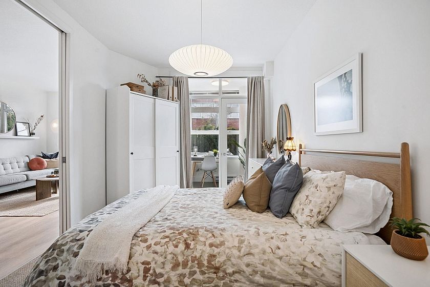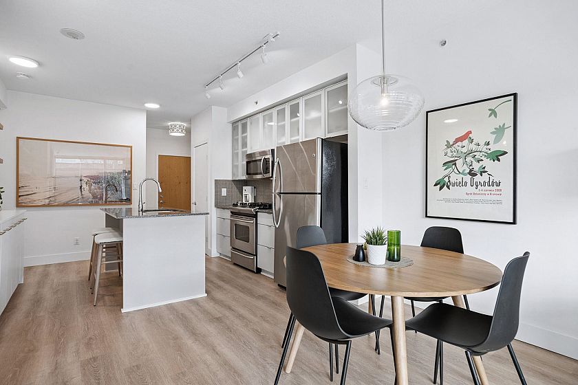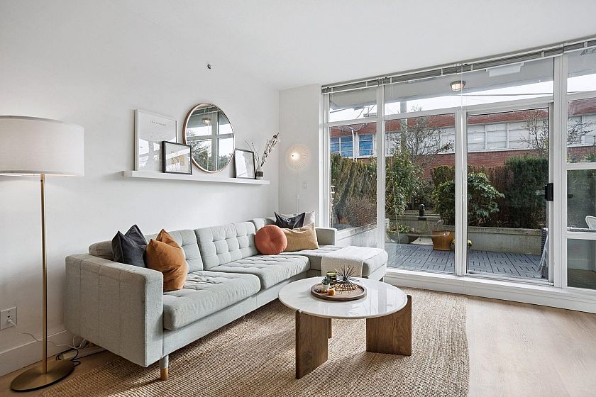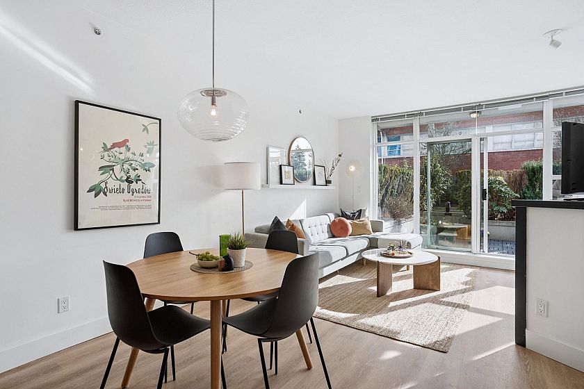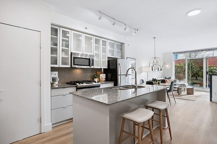 Oversized 1bd + den- garden patio home in the heart of Mount Pleasant.This one checks all the boxes blending privacy w/functionality. The smart layout offers dedicated office/flex space, spacious bedroom w/an oversized walk-in closet & cheater ensuite.Large windows fill the living/dining area w/natural light.Custom millwork adds style & storage plus bonus large in suite storage/pantry to keep life organized.Updated lighting & flooring freshen the space & newer dishwasher & laundry.Outside find a private garden patio- perfect for entertaining & relaxing.Well-managed building-1 storage, pets allowed, bike storage & social room. Close to transit, parks & schools. Steps to some of the city's best restaurants, cafés & boutiques. Open House Thur Mar 5 5-630pm, Sat Mar 7 & Sun Mar 8 2-4pm.