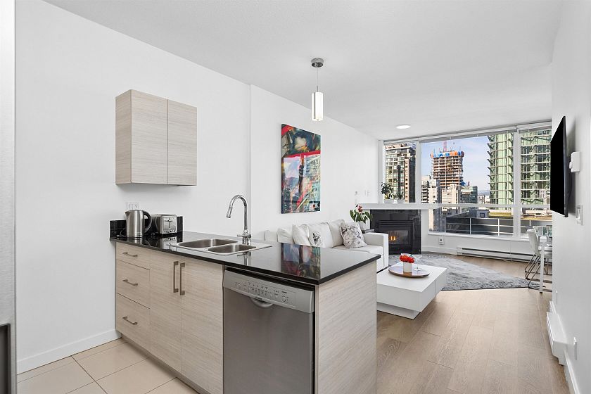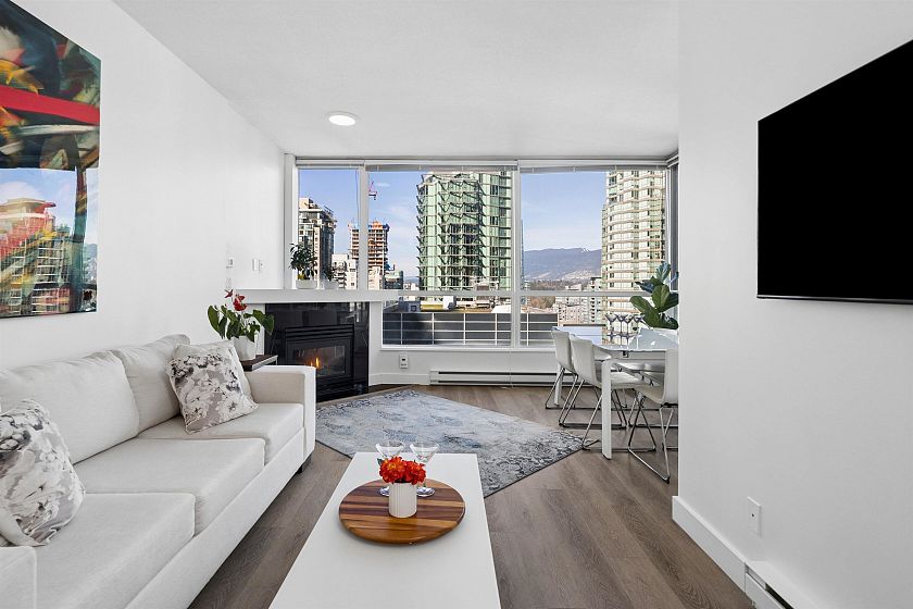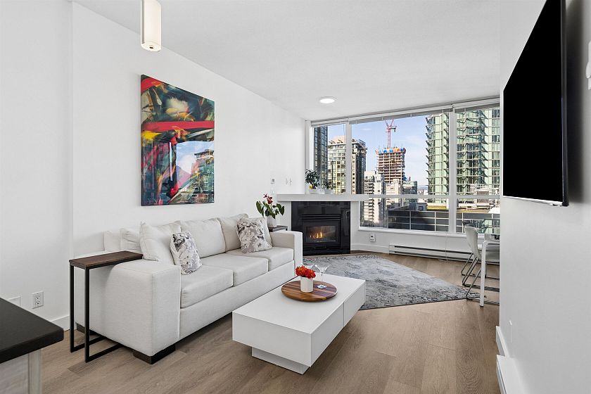 Welcome to The Venus building! a spacious 1-bedroom, 1-bath + den corner home in prestigious Coal Harbour, built by Pinnacle International. Featuring 9-foot ceilings, floor-to-ceiling windows, and an open-concept layout filled with natural light, this residence offers corridor views toward Coal Harbour, Burrard Inlet, the North Shore Mountains, Downtown, and Stanley Park. Enjoy laminate flooring, a cozy gas fireplace, a private balcony, and a modern kitchen with granite countertops and a gas range. Resort-style amenities include 24-hour concierge, indoor pool, fitness centre, 2 guest suites, party and media rooms. Steps to the seawall, Robson Street, and world-class dining urban living at its finest. First showings will take place at the Open House Sun March 22 from 2:00 4:00.