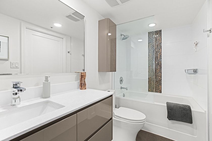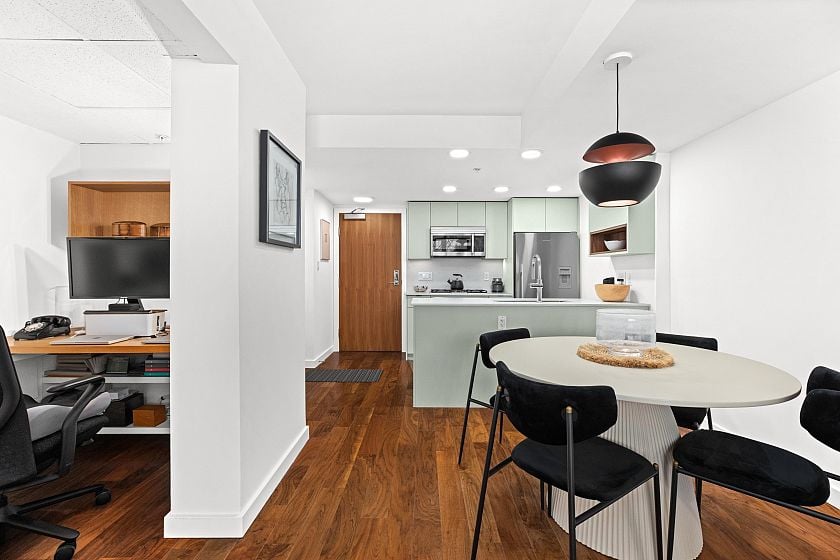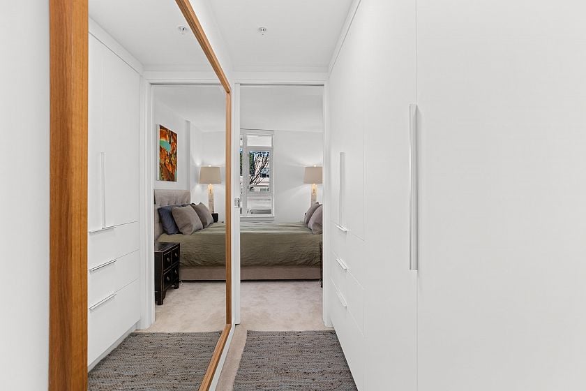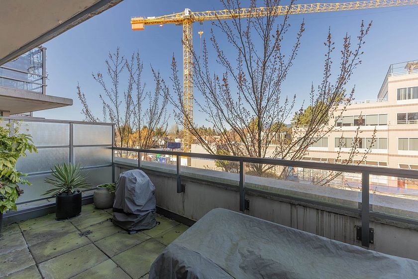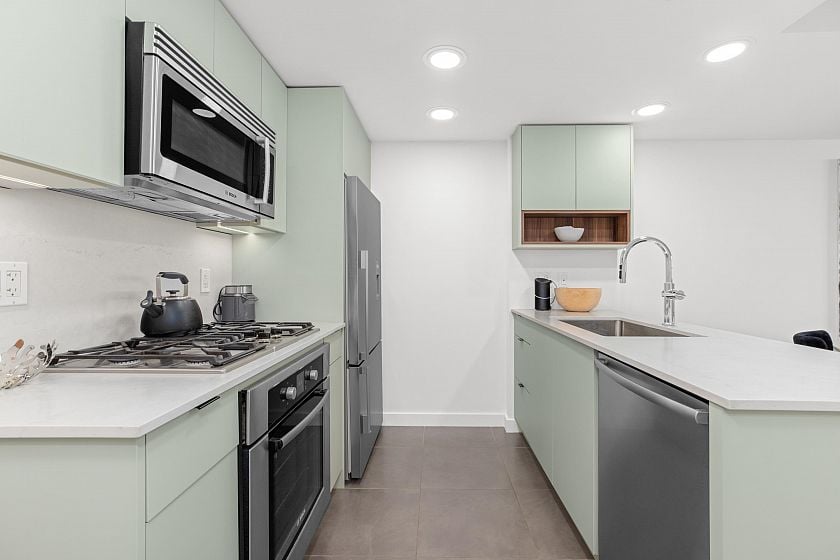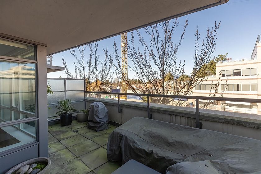 An elevated expression of modern Kitsilano living, this beautifully curated residence offers refined style and rare tranquility. Set back with serene mountain views, the home feels private and peaceful. Flat ceilings, fresh designer paint, walnut engineered floors and plush premium carpeting create a sophisticated flow throughout. The spa-inspired bathroom features elegant tile, floating vanity with ambient lighting and sleek glass divider. The kitchen is enhanced with custom cabinetry and soft-close storage. A stunning den offers the perfect executive home office. The true showstopper is the oversized patio — an entertainer’s dream that seamlessly extends your living space outdoors. 1 parking, 1 storage.