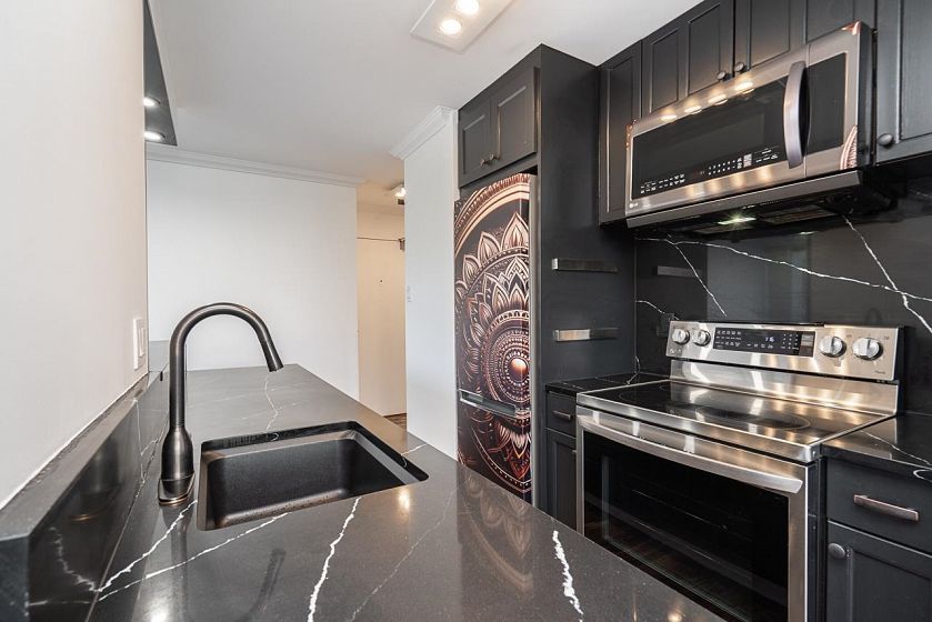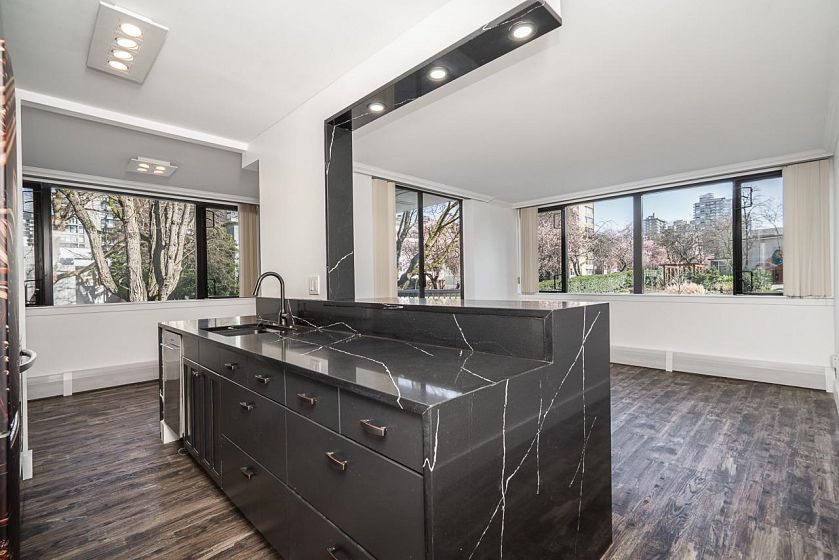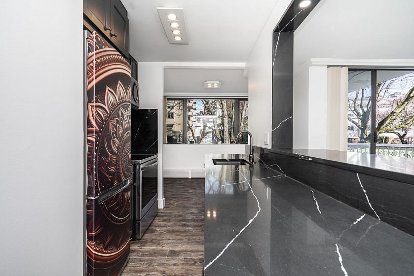 Welcome to the "SANDPIPER"! Located in one of Canadas most desirable neighborhoods, steps away from world renowned amenities. This bright & spacious 1 bed + 1 bath CORNER UNIT has been fully remodeled w/ elegant style. Featuring flowing onyx QUARTS countertops & backsplash, shaker cabinets, NEW S/S appliances, durable vinyl floors, LED lighting & more. Overlooking the beautiful garden area, sit on your balcony & enjoy the recent upgrades to the building. These include the garden & parking membrane, building facade & windows, elevators, lobby & more. Step out into the vibrant streets & walk to iconic English Bay along the scenic Seawall to Stanley Park. Enjoy shopping & dining on Denman & Robson. Make friends at Denman Village. Comes w/ PARKING & LOCKER. Pet friendly building. Call Now!