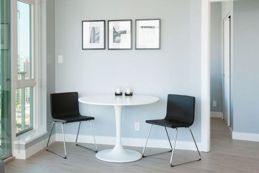 This stunning southwest-facing 1 bed + flex corner suite is drenched in natural light, with floor-to-ceiling windows framing jaw-dropping views of Downtown, English Bay, and the North Shore mountains. The sleek open-concept kitchen features Bosch appliances, wide stone countertops, a gas range, and a generous sink, flowing into a spacious dining area that easily fits a full-size table for entertaining. Thoughtful built-ins include a dedicated workspace and closet organizer. Enjoy resort-style amenities: a full health and wellness centre, outdoor pool, hot tub, garden terrace with BBQ, games and media room, concierge, and guest suites. Airbnb friendly (buyer to verify building bylaws and city licensing requirements). OPEN HOUSE: Saturday & Sunday - 2-4pm