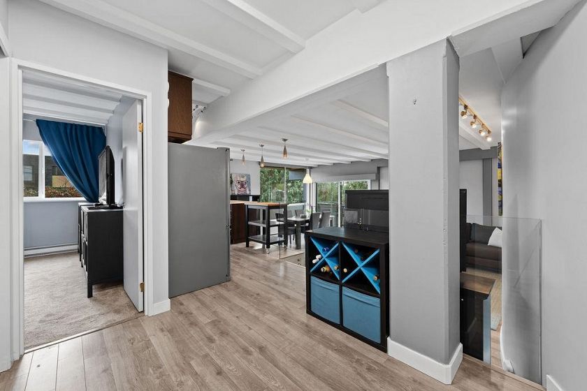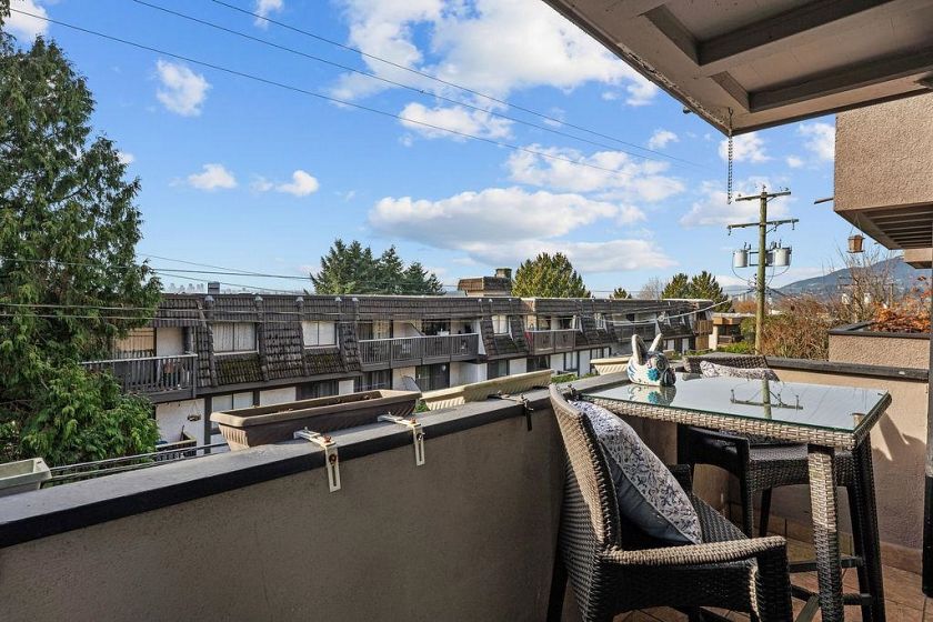 Welcome to Wendral Court, a concrete boutique building in the heart of Lower Lonsdale. This SE-facing large 1 bdrm offers an open-concept layout with a sunken living and dining area, creating an airy, loft-inspired feel. Updates Inc-laminate flooring and a beautifully renovated bathroom. Step into your refined kitchen with quartz countertops and SS appliances, offering a practical space to cook and entertain. The spacious bdrm features a renovated custom walk-in closet. Enjoy morning light from the corner balcony, with views of D/T and Lions Gate Bridge. BRAND NEW balconies are underway and fully paid for by the seller. A move-in-ready home steps to the Shipyards, Lonsdale Quay, SeaBus, shops, & restaurants. In-Suite Laundry. Inc 1 parking & 1 storage. Pet friendly. Call to View!