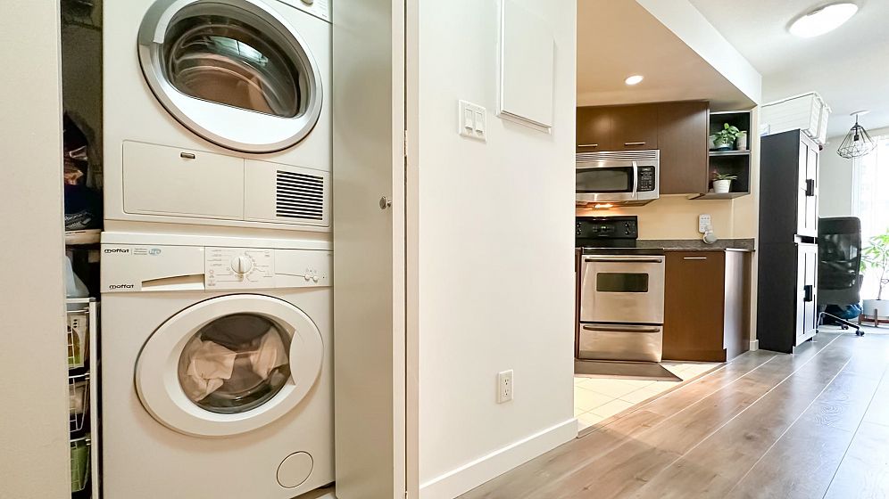 Welcome to "1212 howe" by reputable developer, Wall Financial. This cute 1 BR studio home has everything you need. Ample natural lighting and functional layout with city views and offers a spacious kitchen with stainless steel appliances and engineered laminated flooring. Balcony membrane done in 2022. Located in the heart of downtown Vancouver, with excellent Walk (99), Transit (98) and Bike (91) Scores. Only steps away from restaurants, coffee shops, shopping, Financial, Entertainment districts, seawalls, parks and more. Rentals allowed & 1 dog or 1 cat.