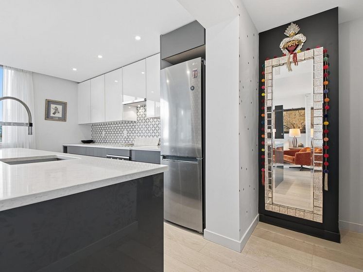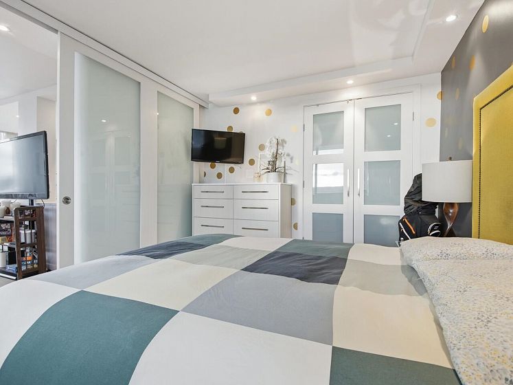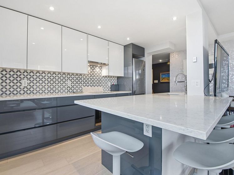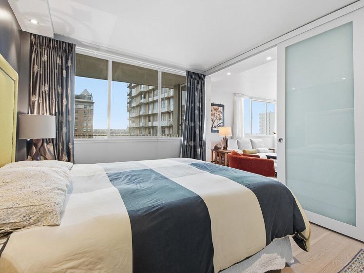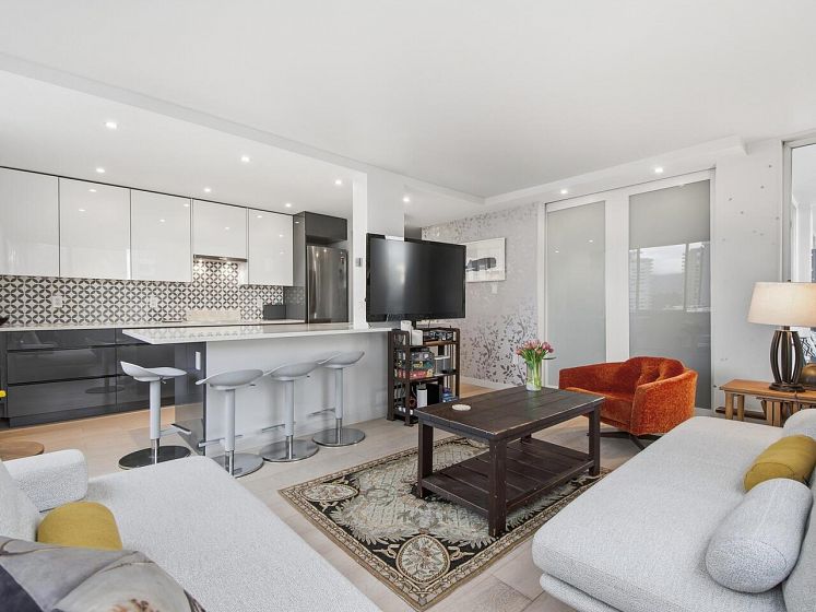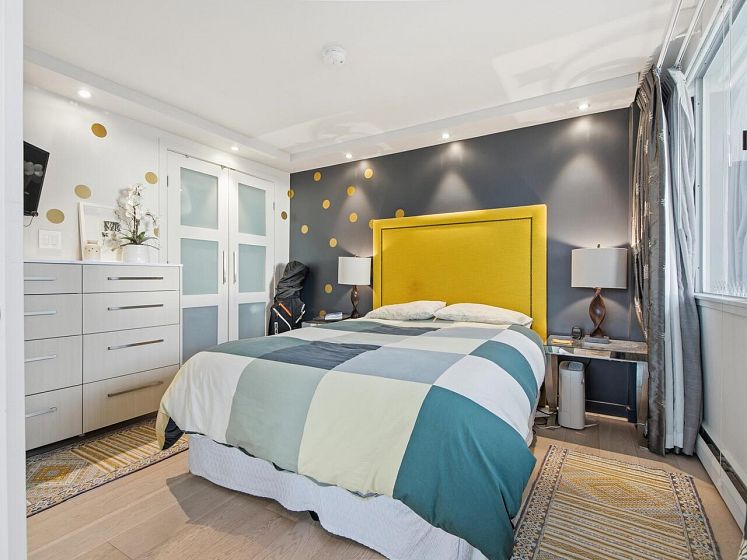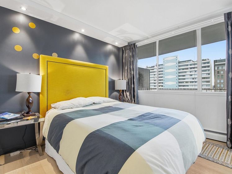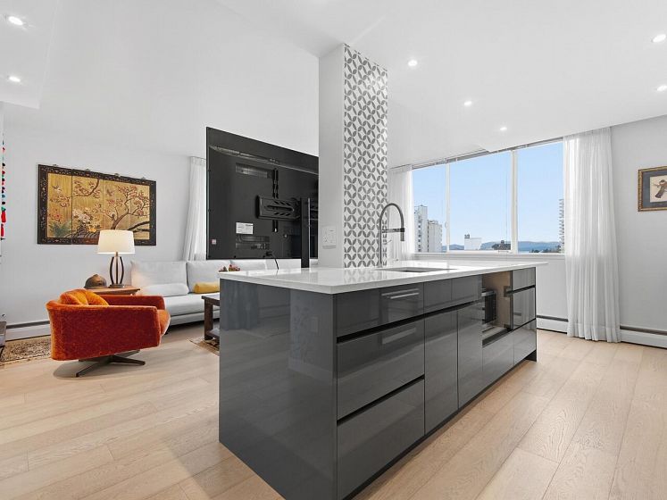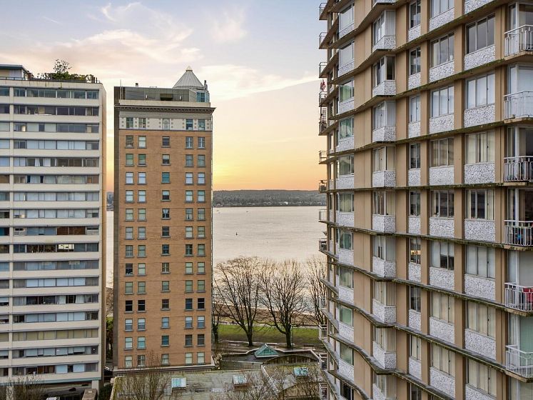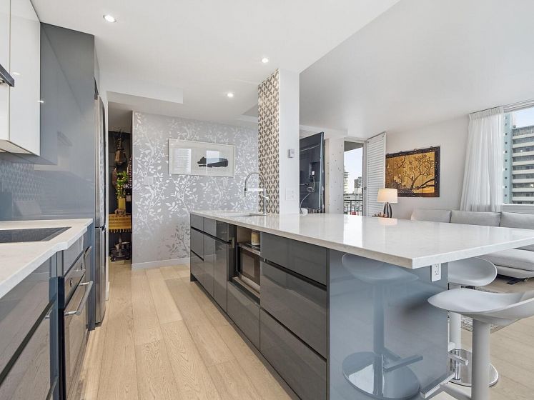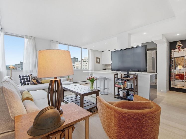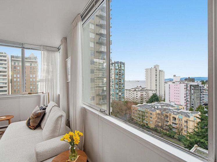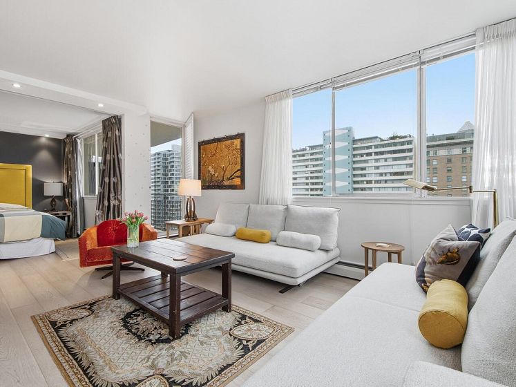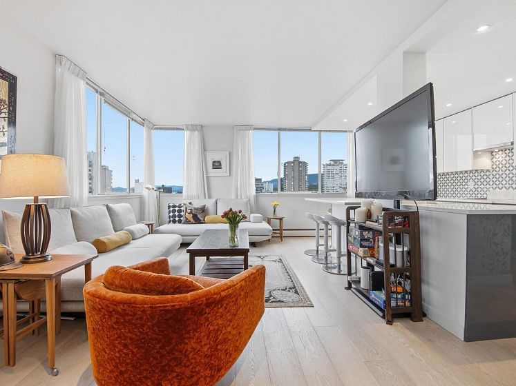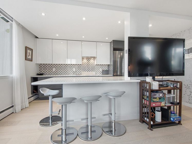 Live the West End lifestyle at The El Cid! This southwest-facing home offers sweeping views over the West End to English Bay and has been beautifully renovated (2017 with City permits). The open-concept layout enhances light and flow, featuring a modern kitchen with quality cabinetry, quartz countertops, designer tile backsplash, and premium appliances including an induction cooktop. The spa-inspired bathroom showcases contemporary fixtures and custom tile work, while engineered hardwood flooring, custom storage, and updated lighting complete the home. A bright, stylish suite in an unbeatable location with transit, groceries, wine stores, just steps to the beach, Stanley Park, cafes, and shops. BY APPOINTMENT ONLY AND YOUR REALTOR MUST BE PRESENT AT ALL SHOWINGS