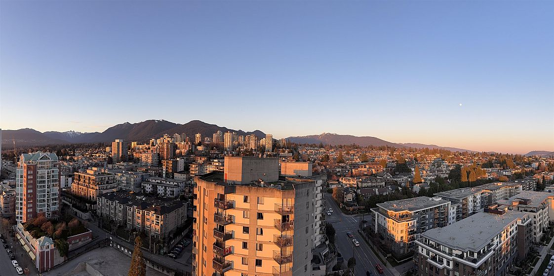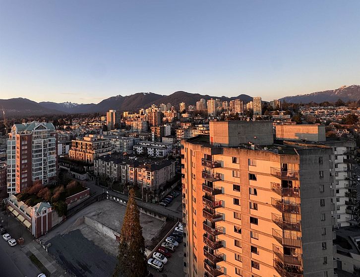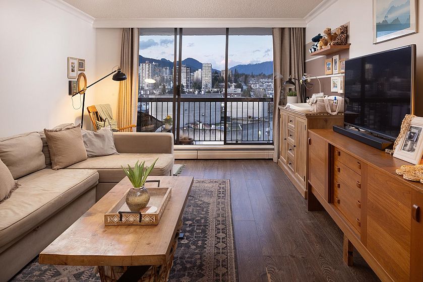 Top-floor penthouse at Talisman Tower! Enjoy panoramic North facing city and North Shore Mountain views from this bright, beautifully updated 1-bedroom. This well-designed 585 sq ft home features an open-concept living/dining area with floor-to-ceiling windows and abundant natural light. Modern kitchen with stone countertops, island, ample cabinetry, and stainless-steel LG appliance package. Laminate flooring and updated bathroom. Large 23' x 4' balcony—perfect for relaxing or entertaining. Well-managed building with shared laundry, caretaker, guest suite, sauna & bike room. Prime Lower Lonsdale location steps to the Quay, SeaBus, Shipyards, Breweries, shops, dining & Waterfront Park. Rentals allowed, pets welcome, 1 dog or 2 cats. Includes parking & storage.