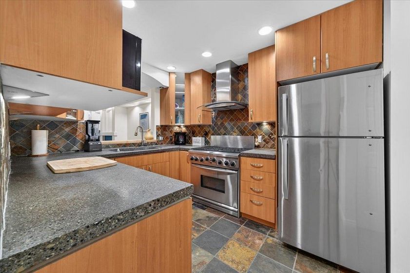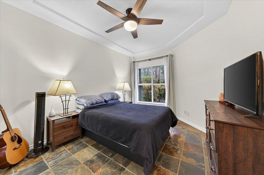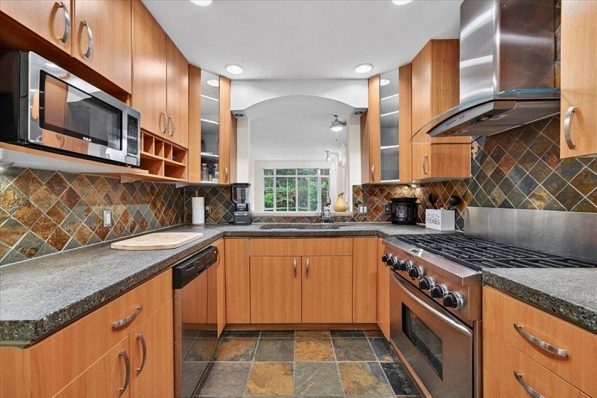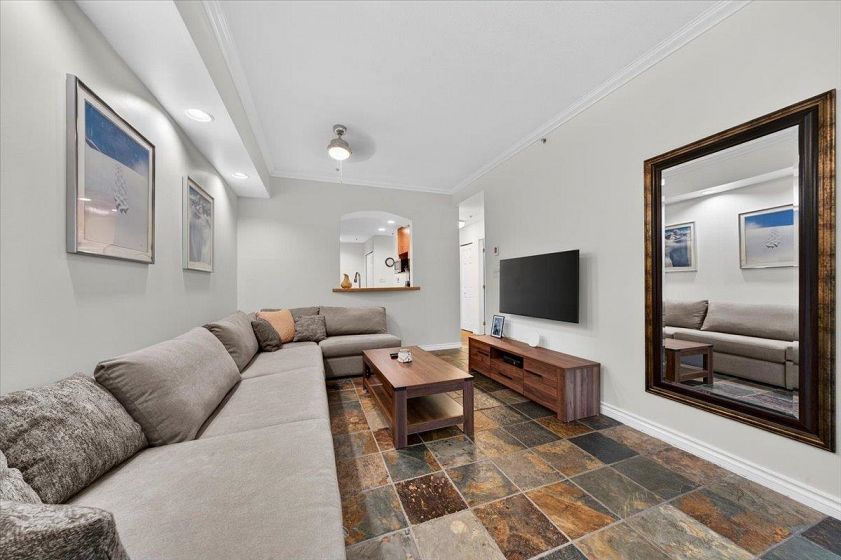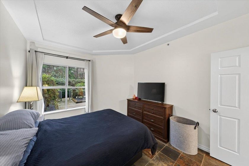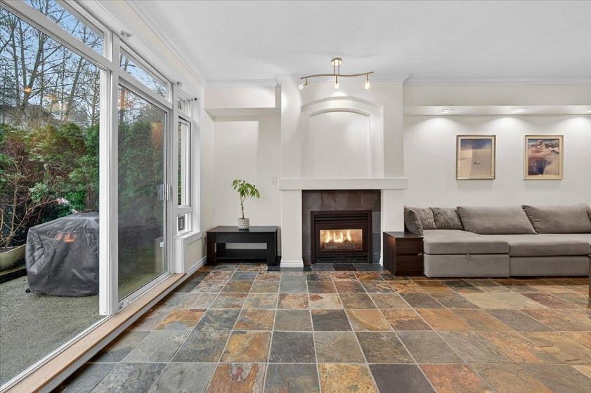 Ground-level home with its own private entrance, offering a townhouse-style feel in sought-after Roche Point. This 1 bedroom plus den residence features a large private patio and garden, perfect for entertaining and relaxing in a peaceful treed setting. Bright and functional layout with updated kitchen, gas fireplace, heated slate floors, in-suite laundry, and large flexible den for home office or guest space. A rare bonus is direct access to secure parking from inside the unit for exceptional convenience. Pet-friendly complex close to golf, parks, trails, recreation, transit, and shopping. Open Thurs 10 am-noon + Sat/Sun 1:30-4 PM March 28 & 29