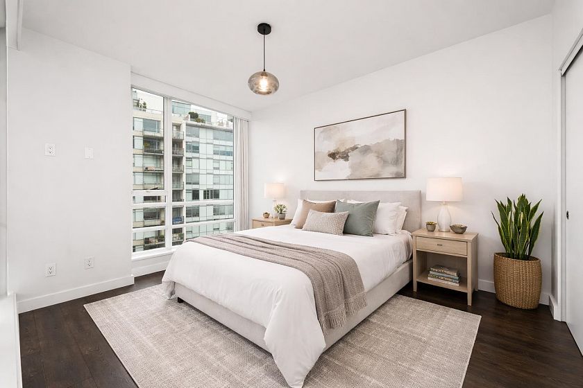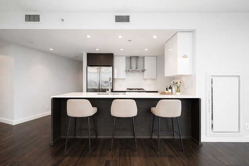 Welcome to Central by Onni! This spacious south facing 1 bedroom + den home offers 710 sqft of thoughtfully designed living space filled with natural light and stunning city views. Enjoy year-round comfort with air conditioning and heating. The modern kitchen features stainless steel appliances, quartz countertops, and a gas cooktop. The versatile den is ideal for a home office or additional storage. Enjoy premium amenities including a full-time concierge, rooftop dining terrace with garden, fully equipped gym, party room, and theatre. Unbeatable location just steps to the Seawall, SkyTrain, and Olympic Village. Includes 1 parking stall and 1 storage locker. Move-in ready!