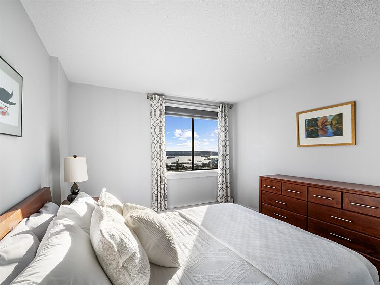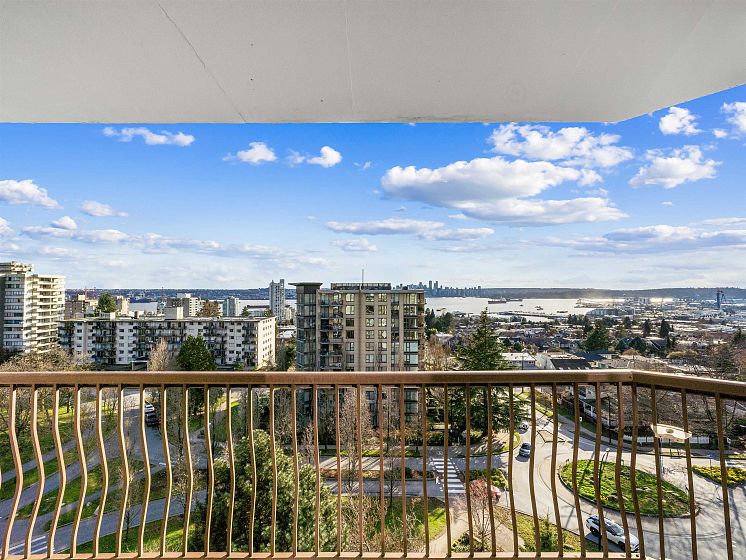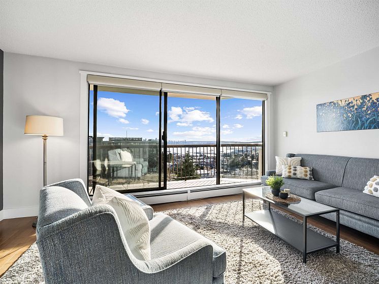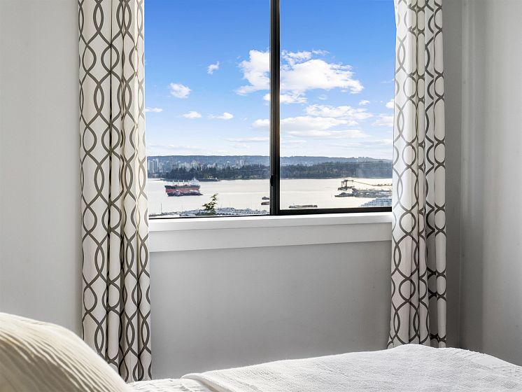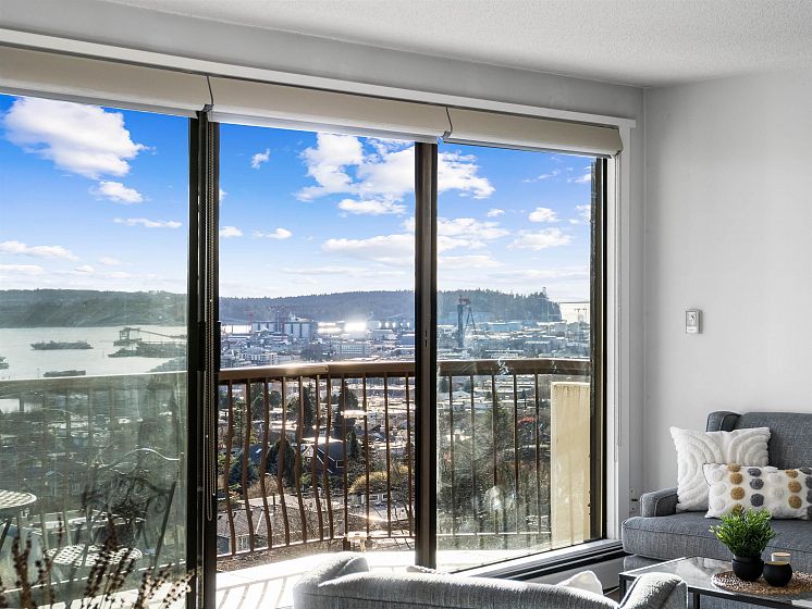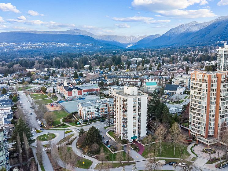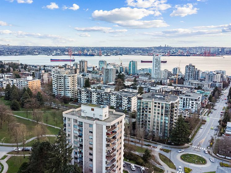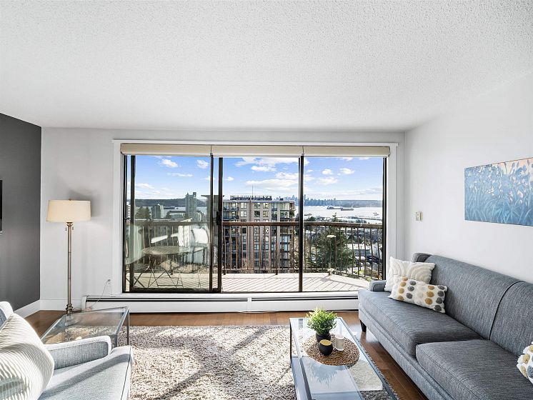 Sweeping water, Victoria Park, and Lions Gate view! This spacious 1BR condo has 678 sf with a bright living room that leads to a balcony with a south west exposure. Spend your evenings watching every gorgeous sunset with unobstructed western views. The living area has hardwood floors and leads to a dining area featuring built in cabinetry for extra storage. The kitchen features granite countertops, wood cabinets and stainless steel appliances. With room for larger furniture, the bedroom is a true sanctuary with a city view. This impeccably cared for suite has an updated bathroom, 1 parking and 1 storage locker. This great building has a rooftop deck with 360 degree views, EV capability, bike cage rental all steps to vibrant Lower Lonsdale. One small pet welcome!
