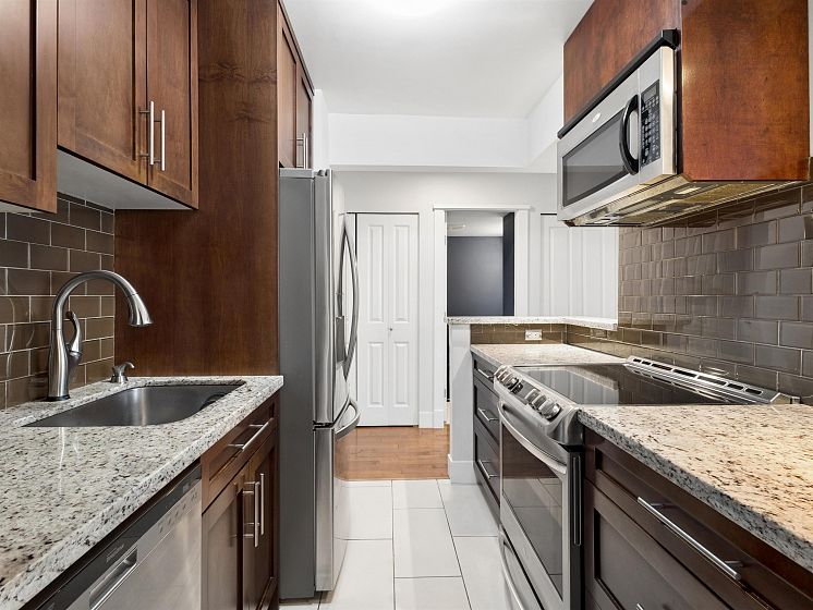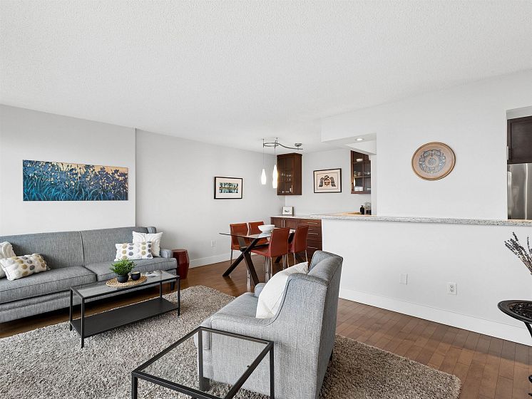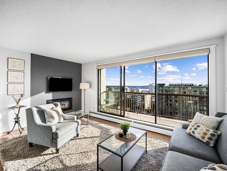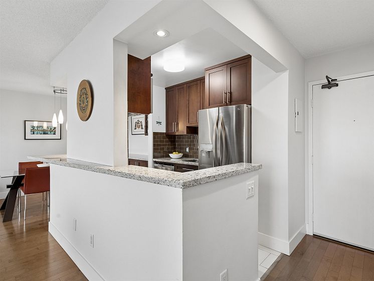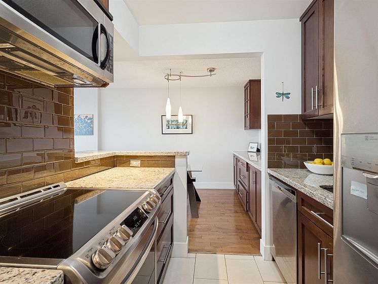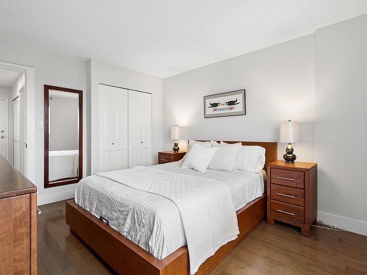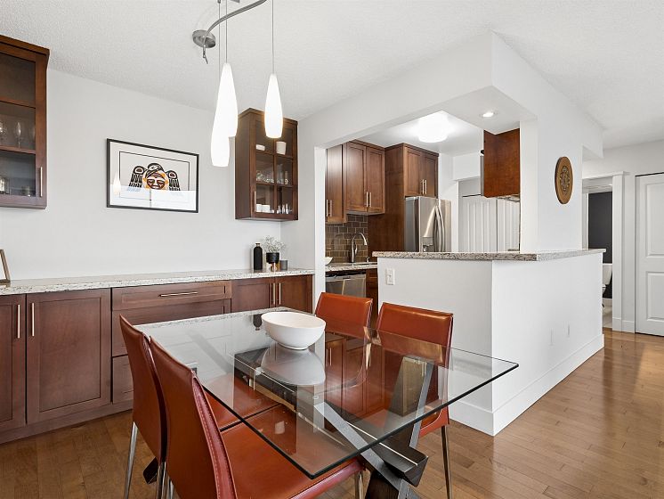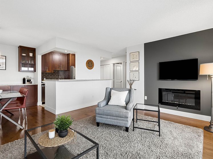 Sweeping water, Victoria Park, and Lions Gate view! This spacious 1BR condo has 678 sf with a bright living room that leads to a balcony with a south west exposure. Spend your evenings watching every gorgeous sunset with unobstructed western views. The living area has hardwood floors and leads to a dining area featuring built in cabinetry for extra storage. The kitchen features granite countertops, wood cabinets and stainless steel appliances. With room for larger furniture, the bedroom is a true sanctuary with a city view. This impeccably cared for suite has an updated bathroom, 1 parking and 1 storage locker. This great building has a rooftop deck with 360 degree views, EV capability, bike cage rental all steps to vibrant Lower Lonsdale. One small pet welcome!