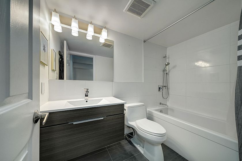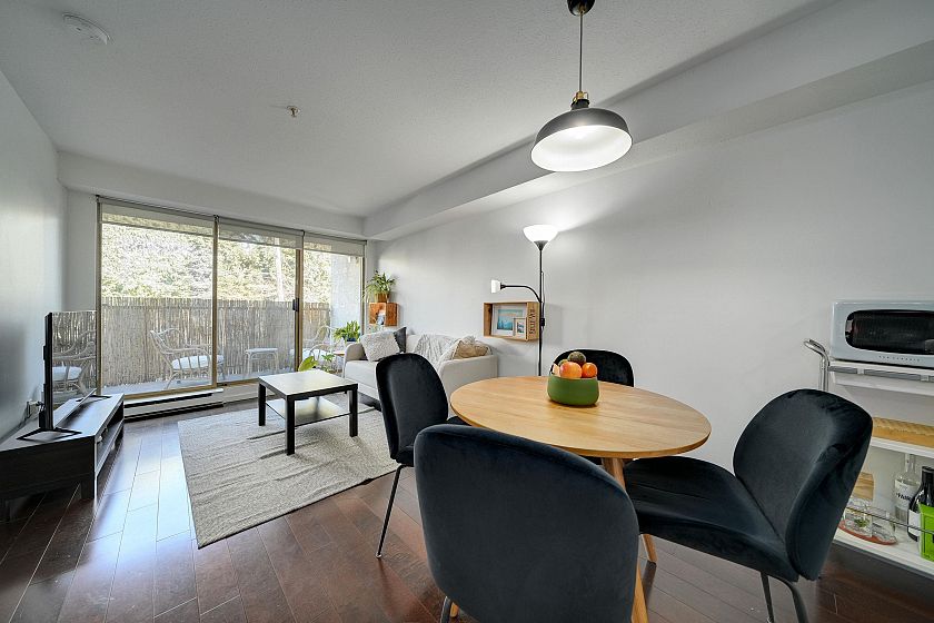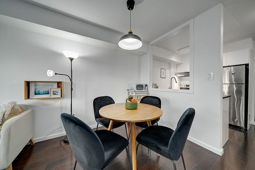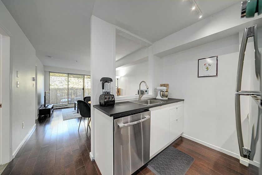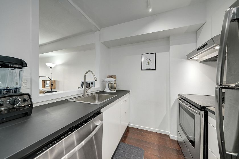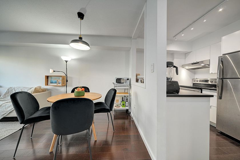 MOUNT PLEASANT opportunity - investment or first-time. This open-concept unit has been thoughtfully renovated, with updated kitchen, white cabinetry, s/s appliances, tile, and a pass-through to the main living area. The bathroom features a nice soaker tub, new cabinetry, storage, lighting, and lots of tile. Wood floors are installed throughout, plus in-suite laundry. The primary bedroom is spacious and will accommodate a king-size bed and other furniture. Balcony accessible through a large picture window/slider to enjoy north-facing mountain views on the quiet side of the building. Insuite flex space/walk-in closet plus, 1 locker, and 1 parking. Steps to Vancouver Community College, the SkyTrain, and an array of restaurants, cafés, and amenities.
