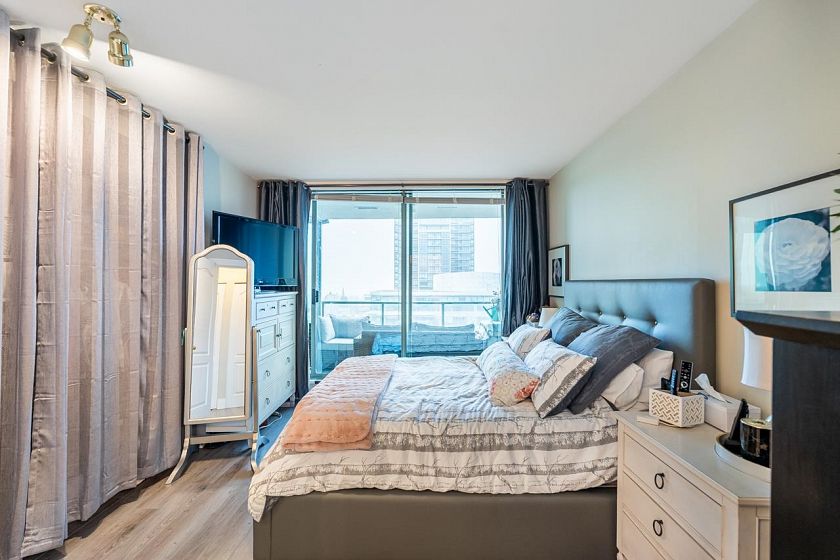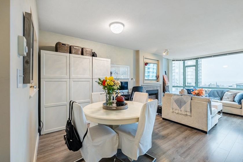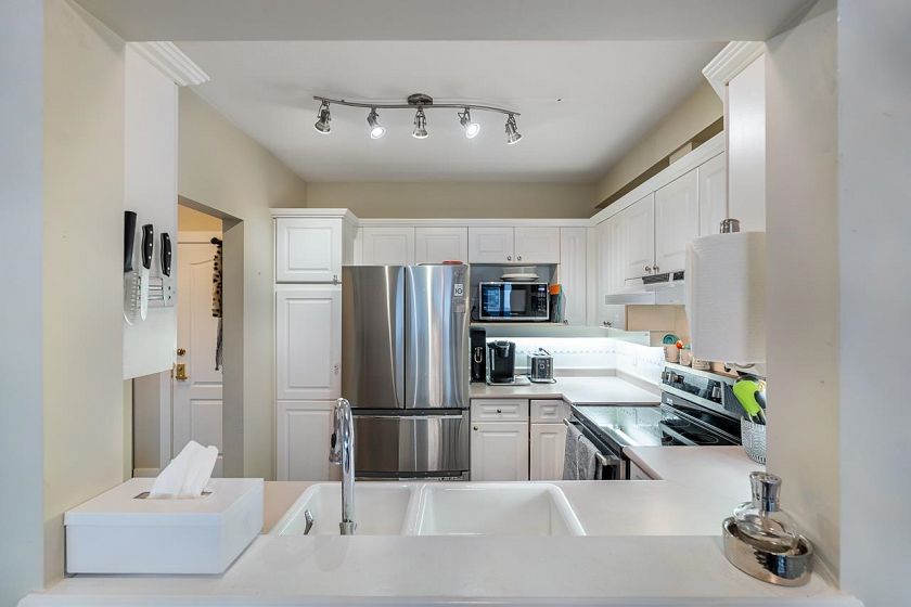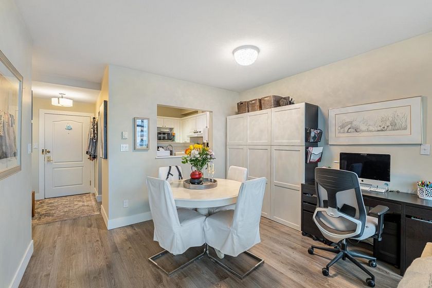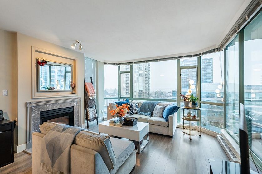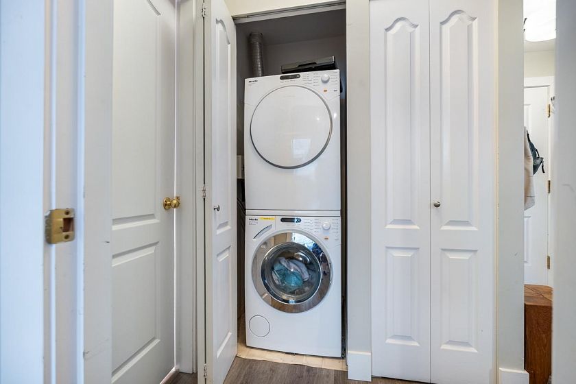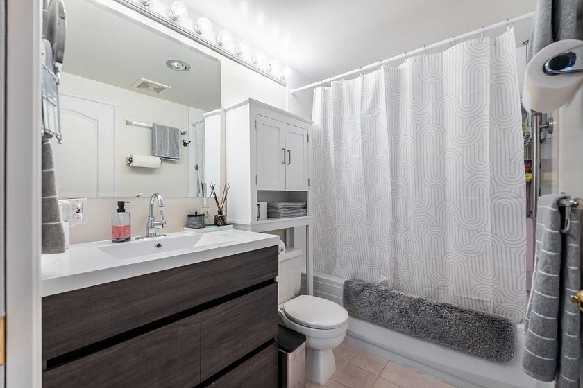 Spacious 723sf one bedroom in this south facing boutique concrete building, "Springhill Place", ideally located between Lonsdale & St. George. This bright, open-concept home features 9 ft ceilings. laminate and tile flooring throughout & plenty of natural light. The kitchen offers white cabinets, newer s/s appliances & a pass-through overlooking the dining/living area. Generous living rm w/large windows, cozy gas fireplace (incl. in maint fee) & city views. Step out to an entertaining-size covered patio. The primary bdrm easily fits a king bed & includes California Closets w/ensuite access. Comes w/secure parking on P1 & a huge storage locker. Unbeatable location, steps to shopping, restaurants, hospital & transit, plus an easy 30-min walk to the Seabus & Lonsdale Quay.