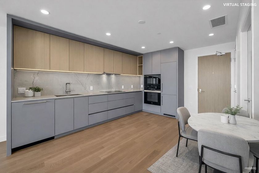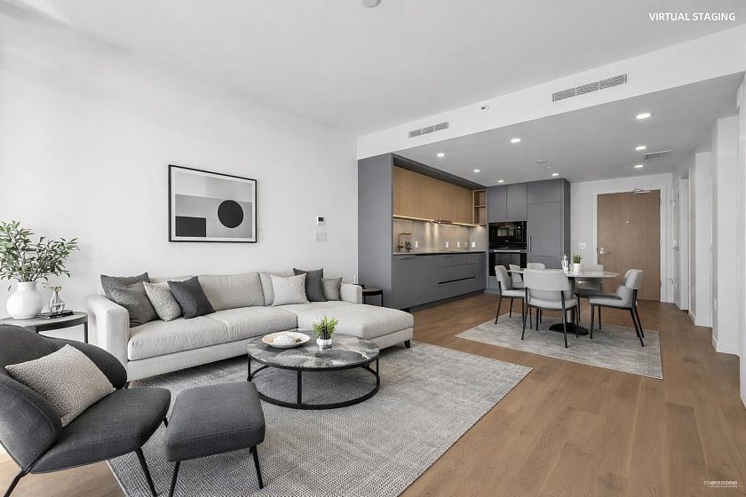 The Hawksley showcases a high standard of craftsmanship & design, w? interiors curated by BattersbyHowat in collaboration w/ BPP and Beedie Living. This beautifully appointed south facing 1 bedroom + den residence offers 688 sqft of refined living w/ unobstructed ocean & city views. Thoughtfully designed with soaring 9’ ceilings, engineered hardwood flooring, A/C & expansive windows filled w/ natural light throughout. Gourmet kitchen is elegantly appointed w/ integrated Miele & Liebherr appliances, living area extends seamlessly onto an expansive private balcony, perfectly positioned to capture stunning ocean and city vistas in a truly spectacular setting. Includes 1 parking & 1 locker. Enjoy access to premium amenities including gym & music room, offering excellent lifestyle convenience.