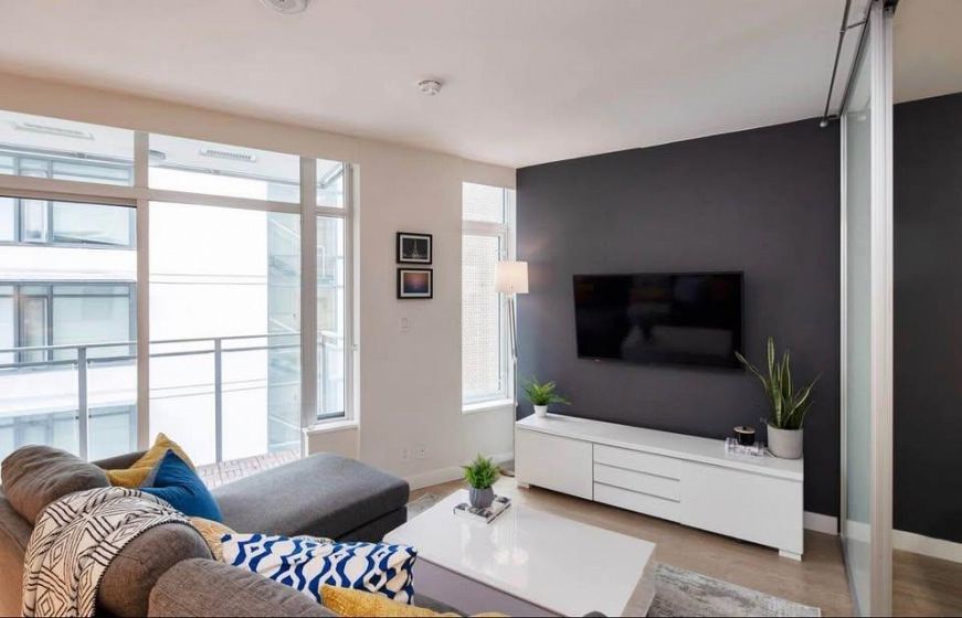 Incredibly efficient, immaculately maintained luxury one bedroom plus den home in the heart of Olympic Village with parking AND storage in an Air bnb friendly building!!! This perfect layout maximizes the size of the living room, and bedroom, allowing for a living experience far beyond the stated size. This efficient floorplan features a large office, perfect for working at home, ample storage, a spacious kitchen featuring high end Kitchen Aid and Jenn Air appliances situated right beside the living room - which is large enough to comfortably fit a L shaped sectional couch! Just minutes walk to the Seawall and the best that Olympic Village offers, Block 100 is a well run building with great amenities such as concierge and a rooftop deck!