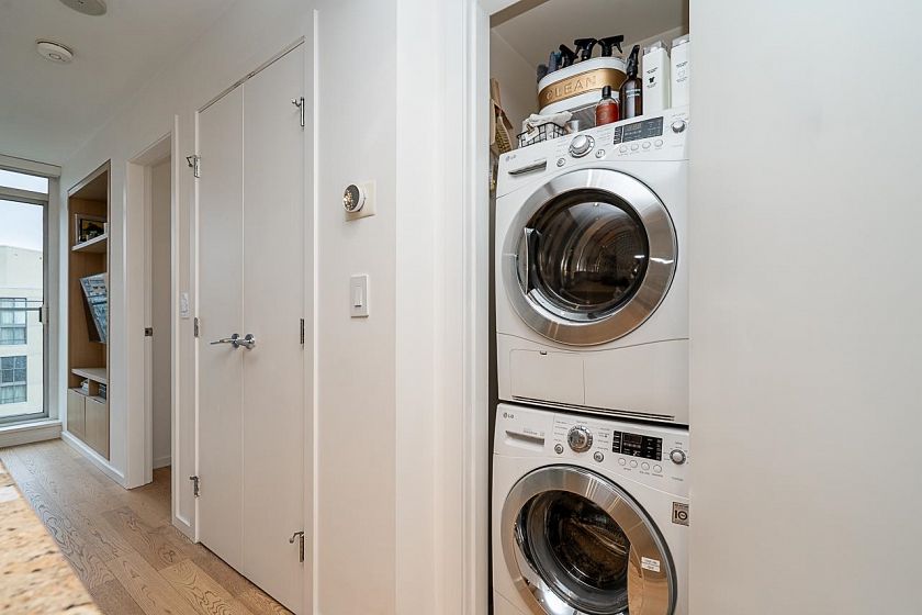 Experience downtown living at Maddox. Well designed: features a smart, efficient layout with no wasted space. Enjoy a spacious, high-end kitchen complete with integrated appliances, a 5-burner gas cooktop, & abundant storage. Heated bathroom floors, AC, and custom millwork for the TV entertainment unit and bedside cabinetry. The bdrm features an updated walk-in closet with added drawers & enhanced lighting.Take in north-facing views of the downtown skyline, as well as corridor views of the North Shore mountains—offering both beauty & privacy. An UG parking stall is included, along with an impressive 9' x 7' huge private storage room located directly behind the parking. Amenities include a well-quipped gym, sauna, party room, & more.