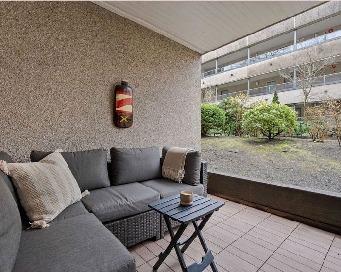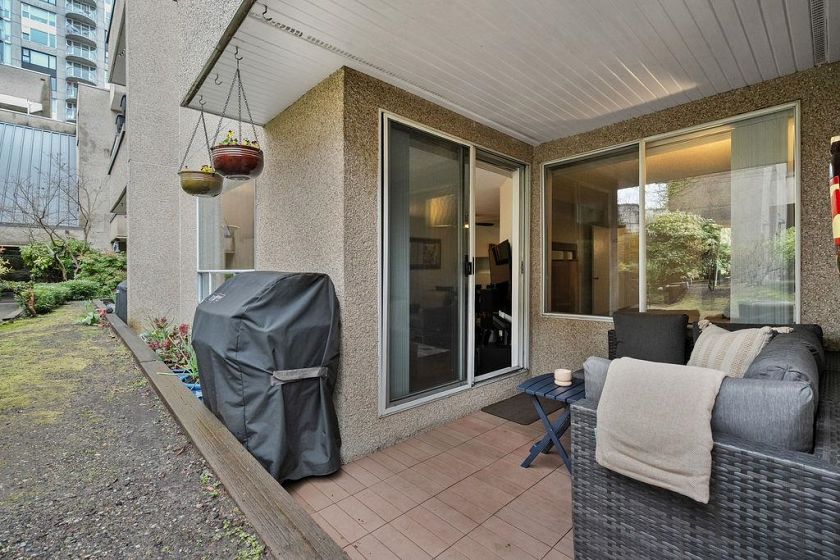 Beautifully maintained 1-bedroom in a well-run West End building with proactive strata, healthy contingency fund and live-in manager. At the end of a quiet cul-de-sac, this unit overlooks the tranquil courtyard. Featuring a large covered patio for year-round enjoyment plus a large walk-in closet and the biggest storage locker you've ever seen (it's like a room!). 3 common rooftop garden terraces available for your lounging pleasure on warm days and evenings. 1 secured parking spot, ample visitor parking, secured bike secure rooms. Pet and rental friendly and a wonderful community. Steps to English Bay, Stanley Park, shops, restaurants, bike routes and the Seawall. A rare opportunity in an unbeatable location. Open house Sat/Sun, April 11/12, 2pm-4pm.