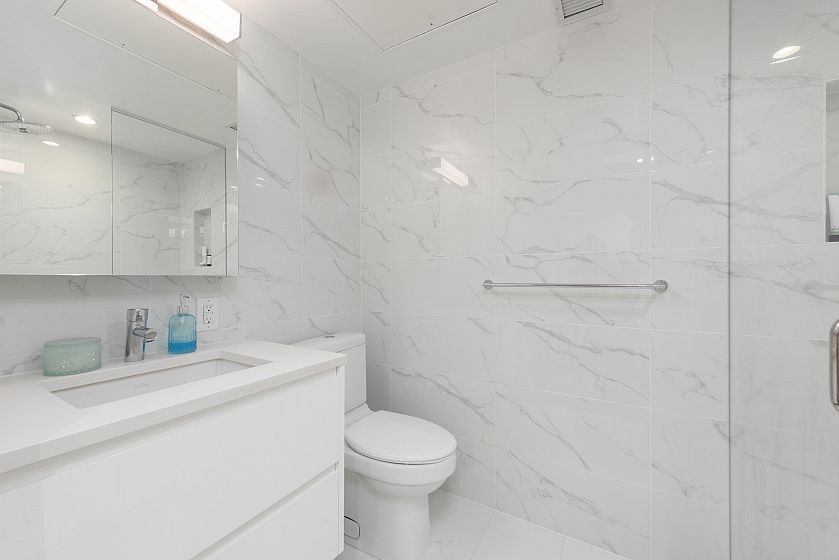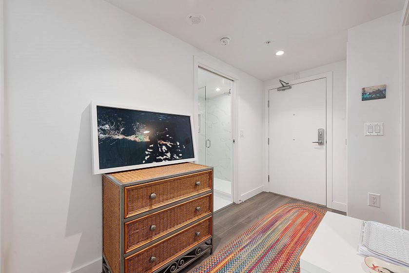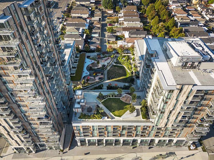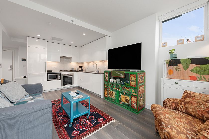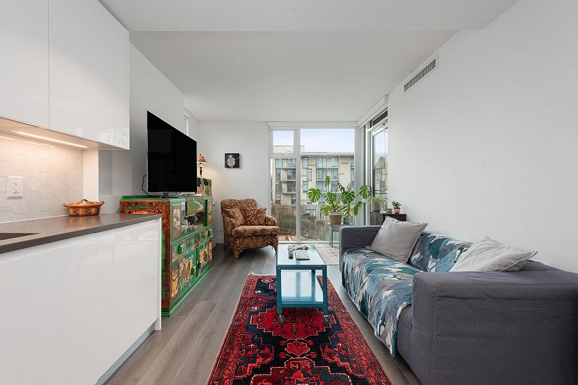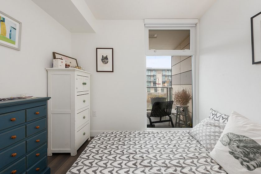 Welcome to Fraser Commons - a highly desirable & cornerstone development for the area! This contemporary, full concrete & exceptionally well-kept 1 bed + 1 bath + flex/office home is a MUST SEE as no other home shows as BRAND NEW as this w/ beautiful wood laminate floors throughout, a modern kitchen w/ tons of cabinet storage + S/S BOSCH appliances, quartz counters, A/C & amenities that incl. concierge, rooftop terrace/park, fitness center, party room, workshare space & a rare on-site daycare facility. The DIFFERENCE MAKER for this is the exposure - a rare corner unit (only 1 neighbour & extra windows) & facing the park courtyard (away from all busy streets & extremely quiet/private). Eateries, grocers & all else steps away! 1 parking + 1 storage incl. OPEN HOUSE: April 18 Sat 2pm-4pm