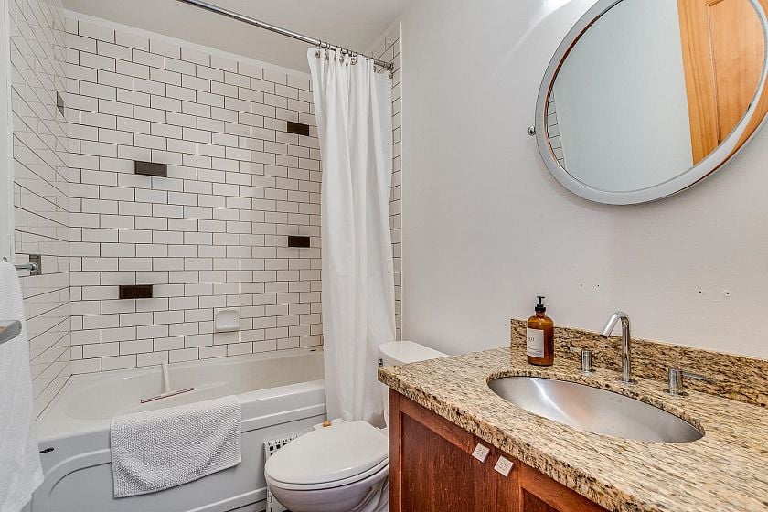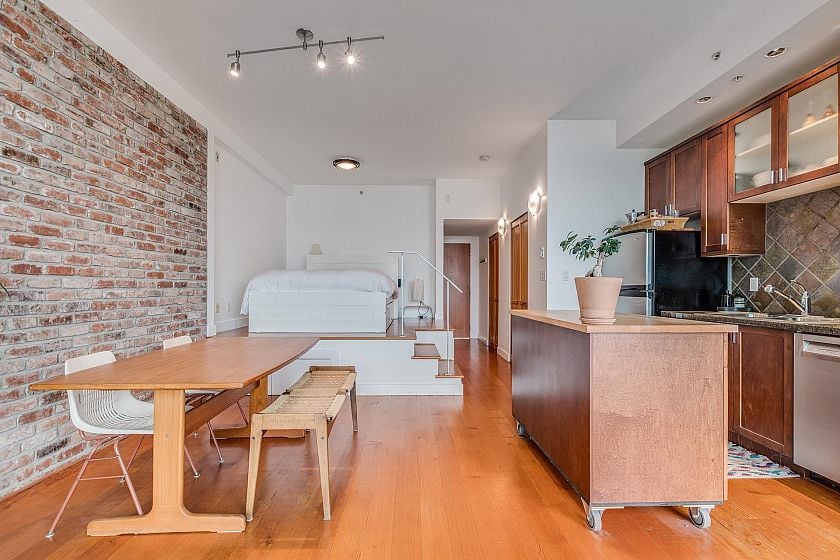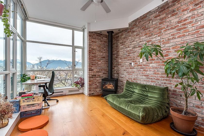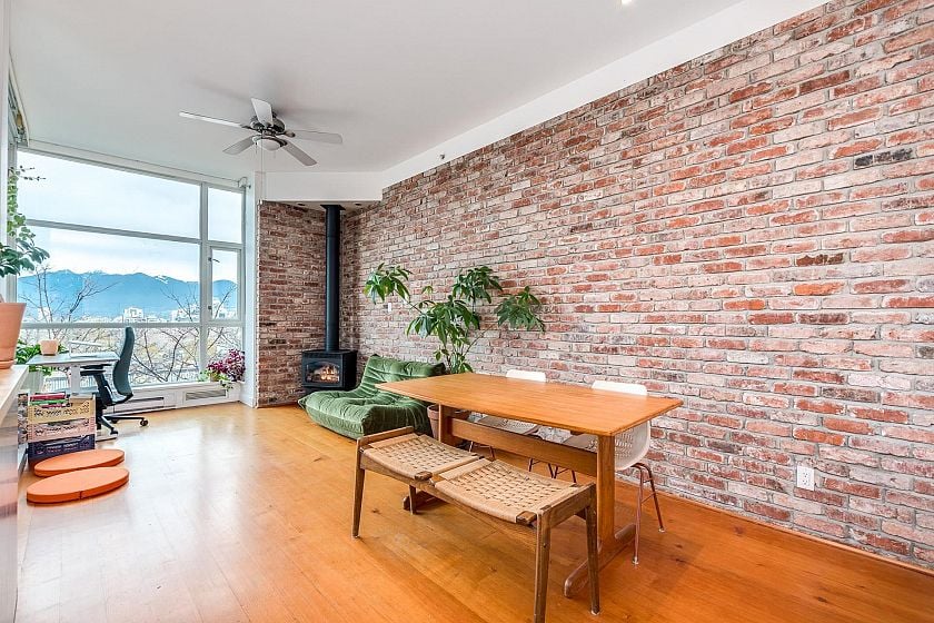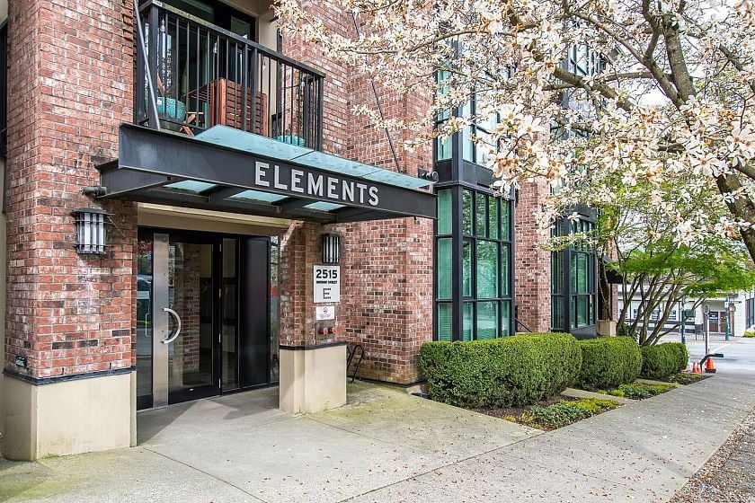 Super cool New York-style loft in the heart of Mt. Pleasant, located in the concrete low-rise "Elements", Soaring 10' ceilings, exposed brick wall, reclaimed fir floors, a gas f/p, granite countertops, and abundant storage, all within a thoughtfully designed layout that lives large. Enjoy fabulous city and mountain views from nearly every angle - including the sleeping platform (open loft design, no walls) and balcony. The unit is set back from the street, with the garden patios of the homes below creating a quiet and private feeling. Additional features include in-suite laundry, a storage room (could be office area), parking, an exercise room, and a library. The central location puts you steps from great restaurants, shopping, and transit, with the new SkyTrain line coming soon.