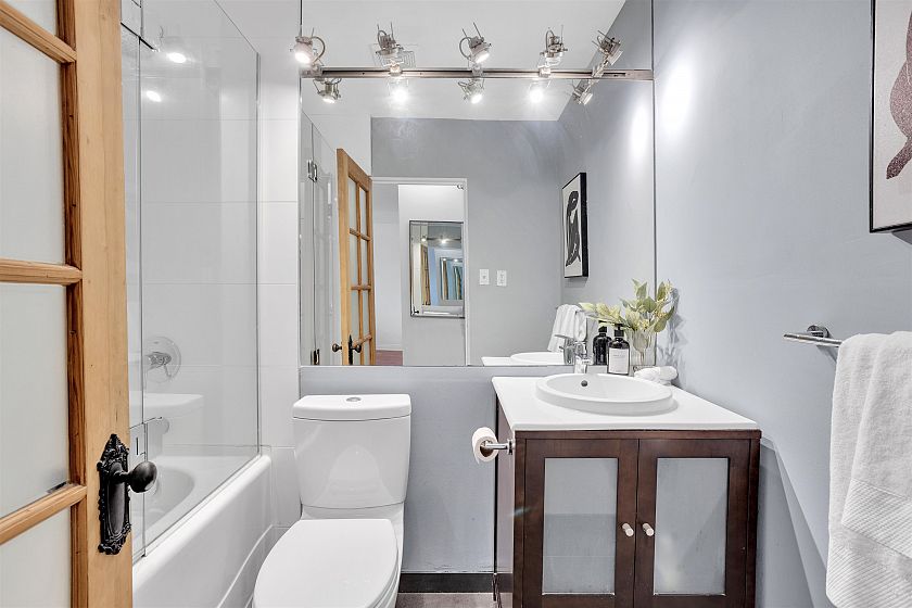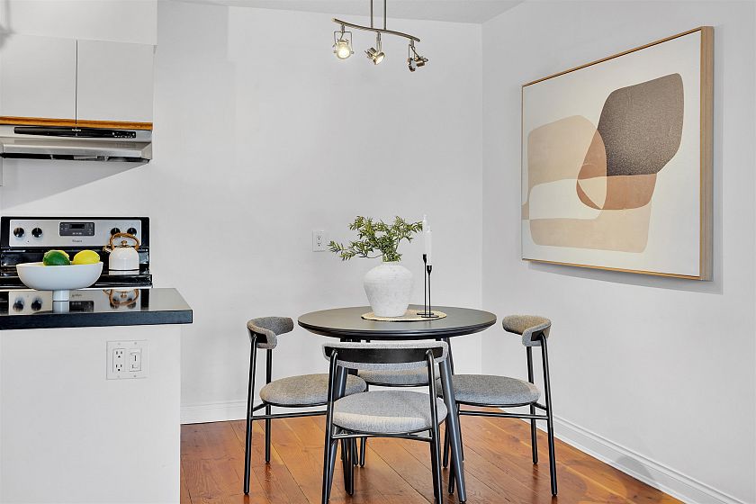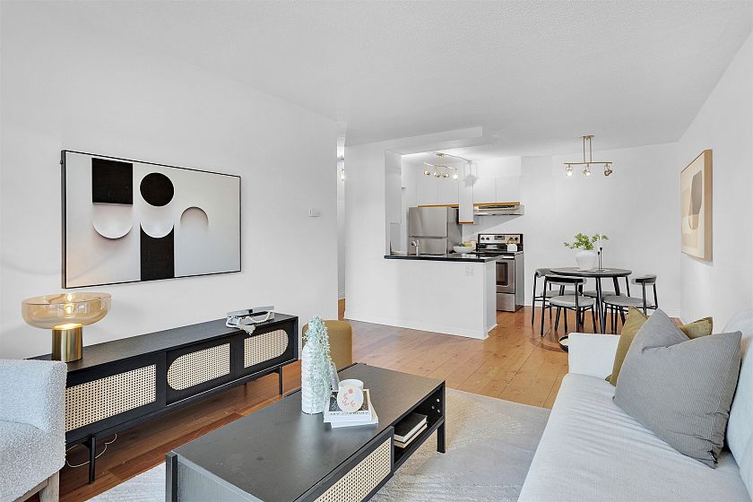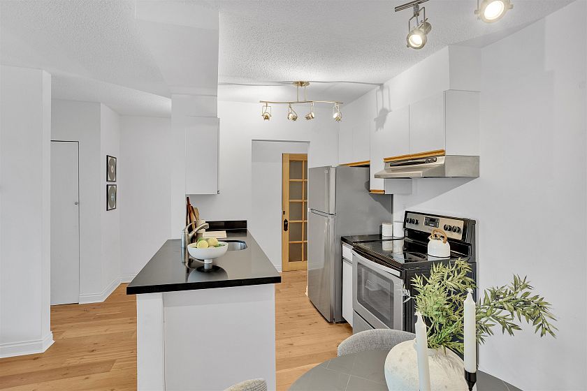 Rarely available penthouse offering over 1,200 sq ft of combined indoor-outdoor living. This bright north-facing 1-bedroom features 569 sq ft of interior space and an exceptional 729 sq ft private rooftop deck on the same level creating a seamless extension of your living area, perfect for entertaining, relaxing, and enjoying peaceful North Shore mountain and treed views. Beautiful reclaimed hardwood flooring runs throughout, adding warmth and character, complemented by tasteful updates, a clean open kitchen, and fresh paint. Move-in ready with the opportunity to personalize and elevate over time. Well-maintained building with shared laundry. Includes one parking stall and storage locker.