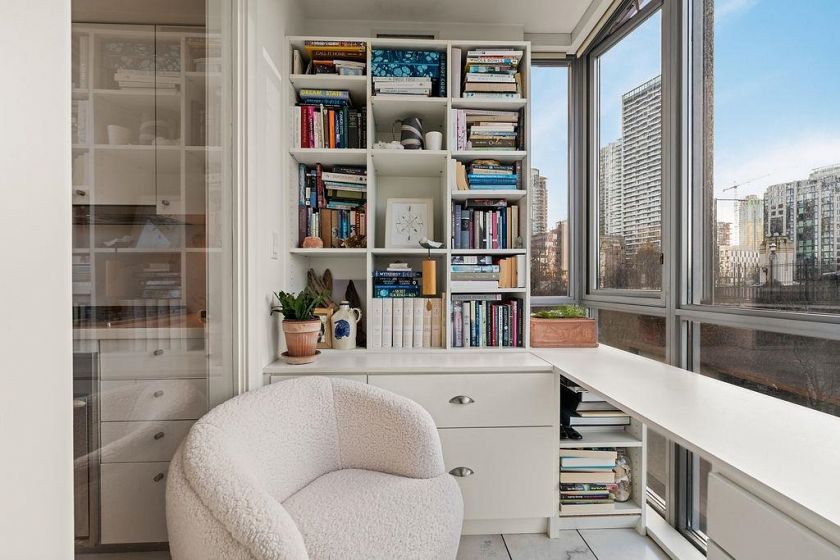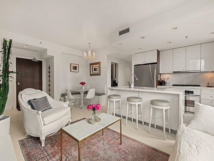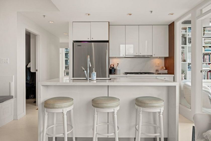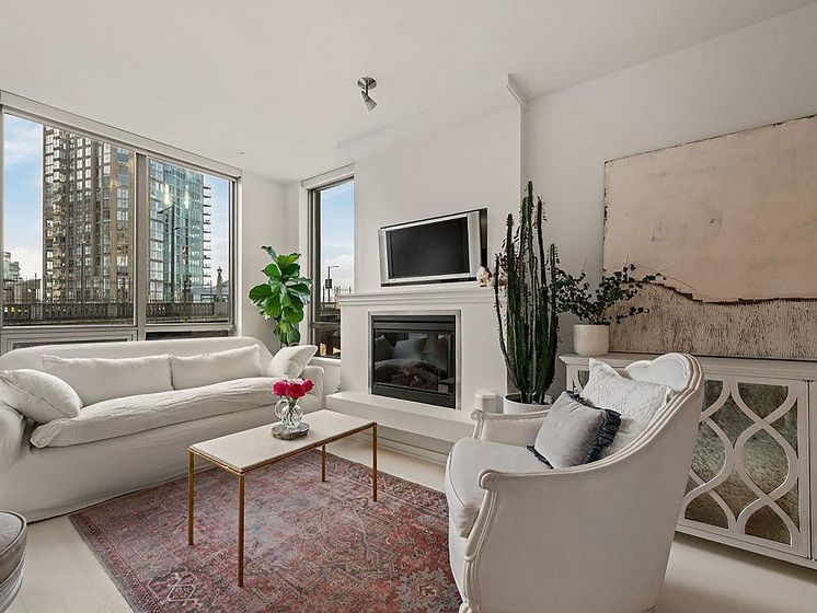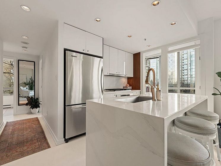 Experience refined coastal living at Alvar, in sought-after BEACH DISTRICT! This beautifully renovated 1 BED + DEN home offers an elegant, open-concept layout in one of the BEST BUILDINGS in the area. Expansive windows flood the space with natural light, complementing the airy 9-foot ceilings and the sophisticated white interior feels warm, welcoming & effortlessly timeless! Storage is abundant with a huge pantry and storage locker. The den/office with built-ins creates the perfect work-from-home retreat. Cozy fireplace anchors the living space, adding charm & comfort. A/C, 1 parking and pet-friendly (2 pets), it's a dream! Building amenities include a BBQ, Gym, Media Room, Hot Tub.Every detail has been carefully curated, resulting in a space that feels elevated, serene, and move-in ready.