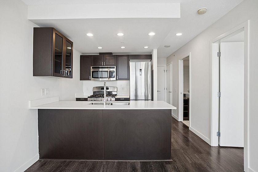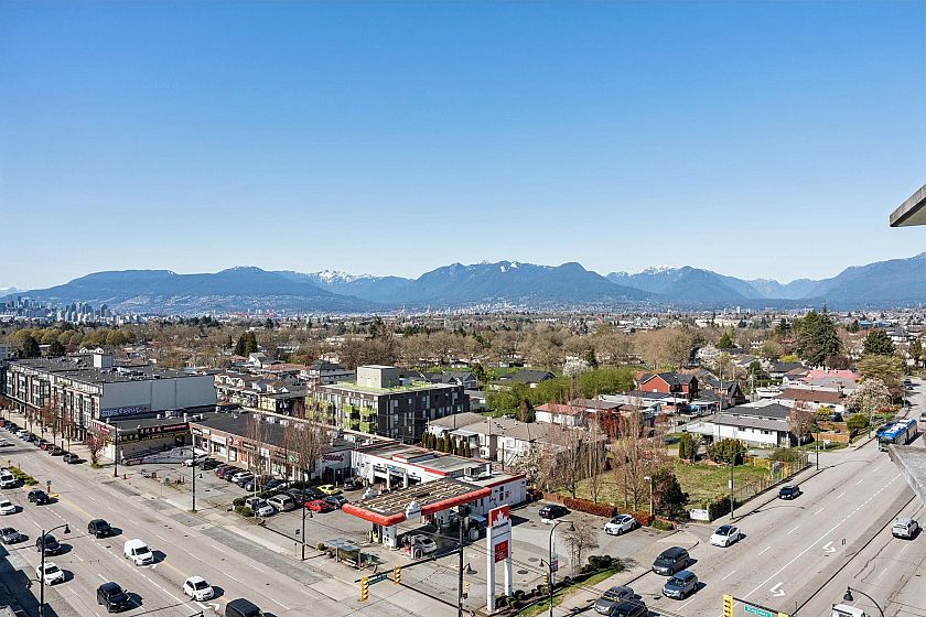 This chic 1 BED+DEN+FLEX is the ultimate urban sanctuary, boasting one of the building’s most coveted layouts. Floor to ceiling windows flood the 577 SF interior with natural light, framing breathtaking CITY & MOUNTAIN views. The gourmet kitchen is a chef’s dream with stone counters, gas cooking & breakfast bar. Work from home in the sun-filled DEN, use the FLEX for custom pantry/storage & unwind on your LARGE covered balcony w/sunset views. Secured parking & locker included. Amenities inc fitness centre, party room, terrace & bldg manager. Prime Kingsway & Nanaimo hot spot: Shoppers at your door, close to T&T, Famous Foods, Trout Lake, SkyTrain (4 stops to Downtown) & all the newest dining spots. Your view, your style, your new Vancouver home - IT'S ALL HERE! Some pics virtually staged