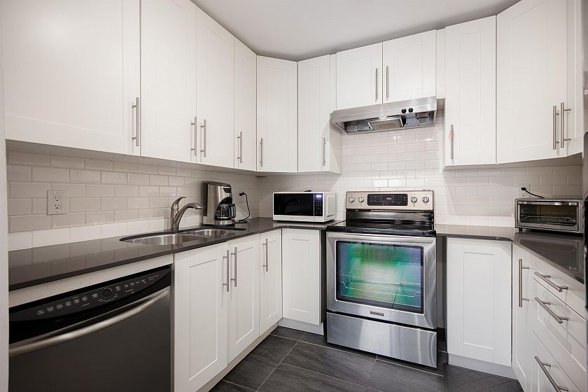 PRIME LOCATION, Beautifully renovated 1 bed/1bath condo on quiet tree-lined street but close enough to enjoy all the amenities of vibrant Lower Lonsdale. Completely renovated open kitchen with S/S appliances, stone counters, and completely renovated bath. Laminate flooring, paint, light fixtures and much more. Great pro-active building with significant upgrades. new roof (2019), re-piping (2013) ,new boiler (2021), new elevator (2022) 2 new washing machines ( 2021) Pets allowed. just a hop to Seabus, Quay, excellent restaurants and shops, Brewery District, Fresh Street market and recreation centre. Just move in and enjoy. Spacious 125 sq. ft. deck for summer barbecuing and al fresco dining. OPEN HOUSE SUN. APRIL 19TH 2:30-4PM
