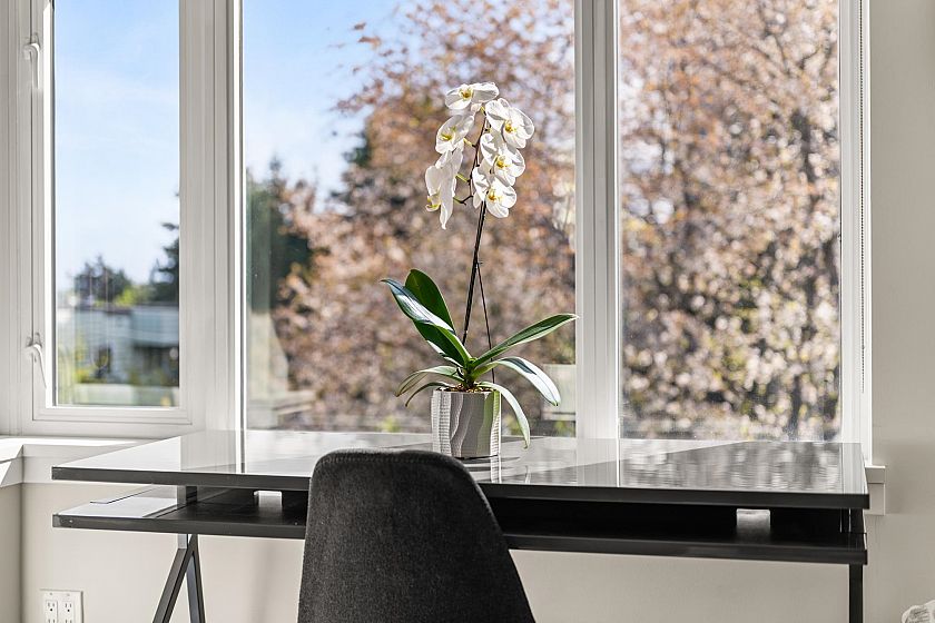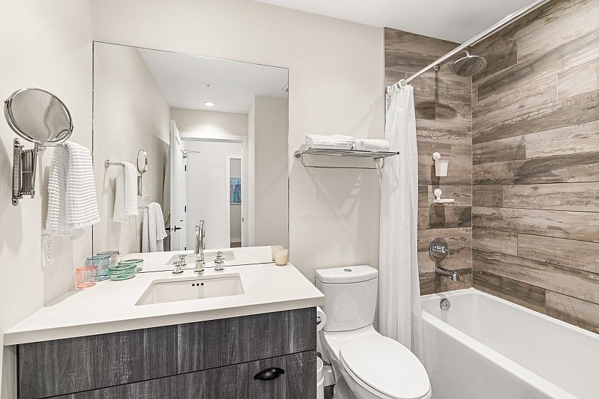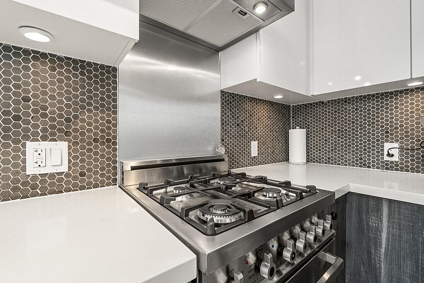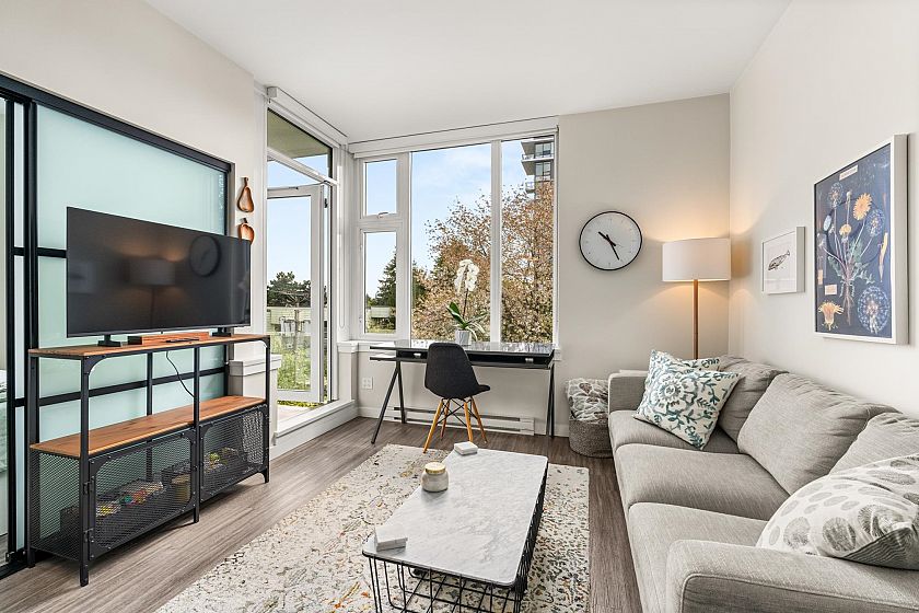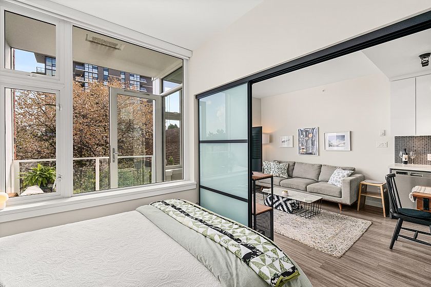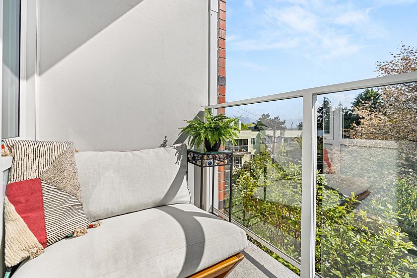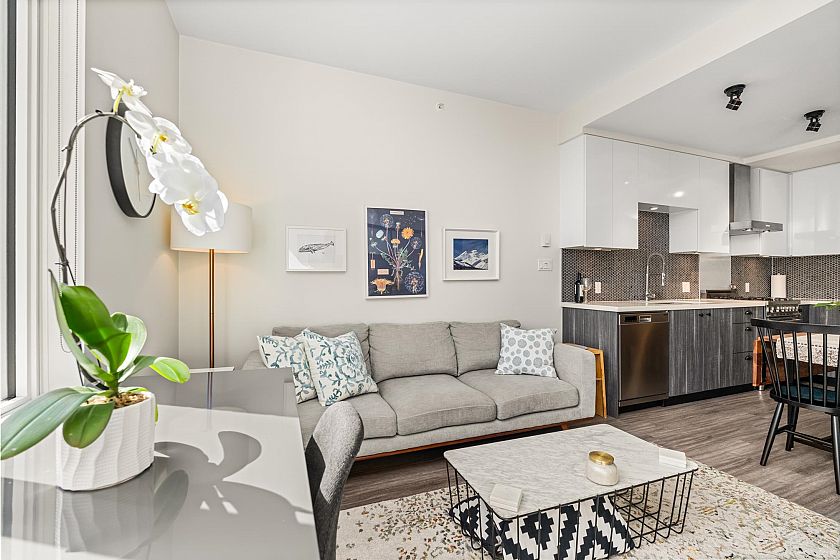 This well-appointed one-bedroom and den suite features ceilings higher than most units in the building, creating an open, airy feel. A smart, efficient layout offers excellent storage, while bright exposure fills the space with natural light and extends onto a private balcony with mountain views. The interior showcases engineered hardwood flooring and a contemporary kitchen with sleek flat-panel cabinetry, hexagonal tile backsplash, modern black hardware, premium Blomberg appliances, and a Bertazzoni gas range. Enjoy a spacious true one-bedroom with a walk-through closet and New York–style frosted glass sliding door, a 4-piece bathroom, in-suite laundry area with bonus storage and sink, and a double foyer closet. Includes parking and storage. Excellent location in the heart of it all.