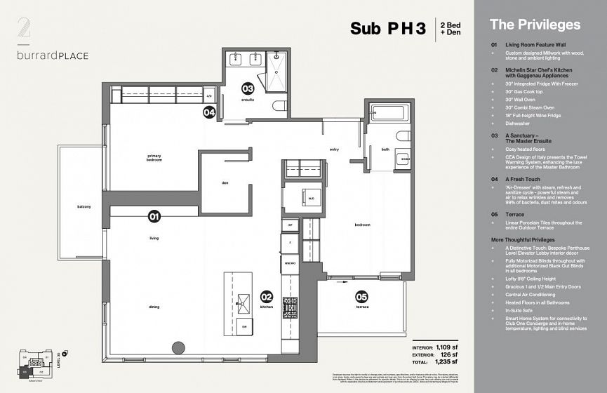 Discover urban luxury living at 2 Burrard Place's Euroluxe Sub-Penthouse. Privileged star luminary & concierge services await, along with 30,000sf of private Club One amenities. This 35th-floor sub-PH offers stunning city/mountain views/False Creek & English Bay vistas from the balcony. Features include A/C, 9'8" ceilings, wide plank hardwood floors, MITON Italian kitchen with GAGGENAU Appliances, and CIELO Italian bath fixtures. 2 EV-ready parking stalls & 1 bike locker. Completion estimated for late 2026.