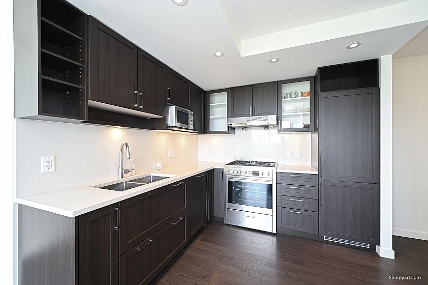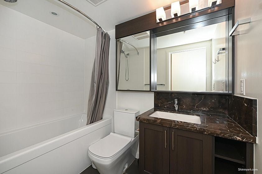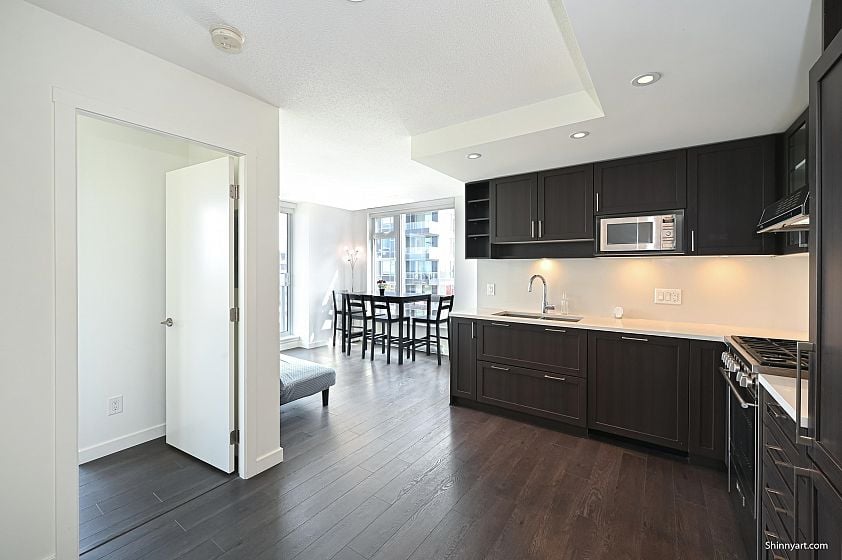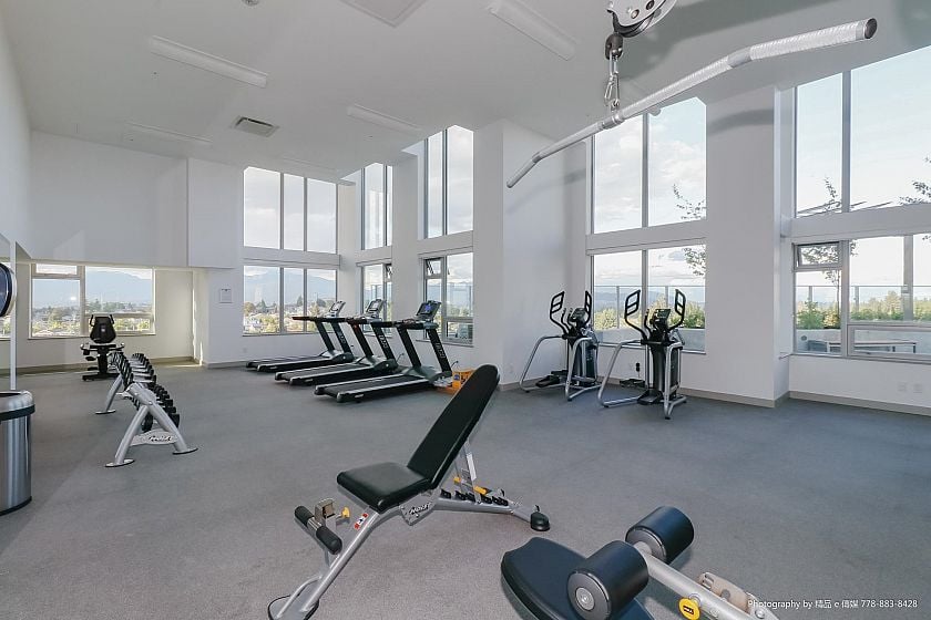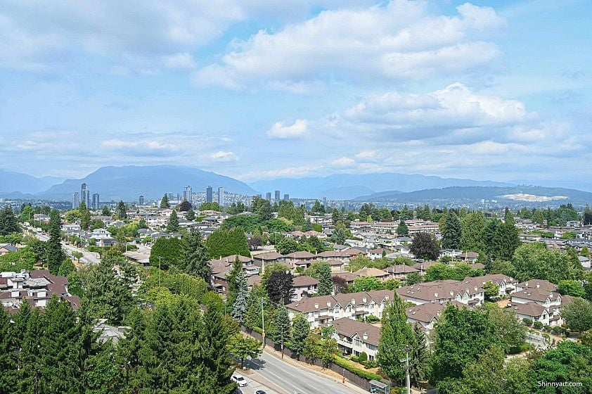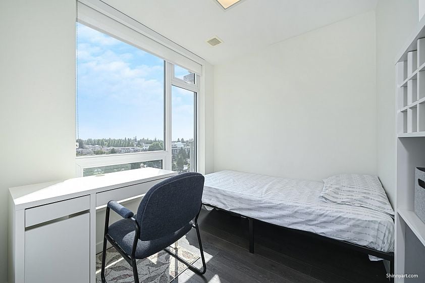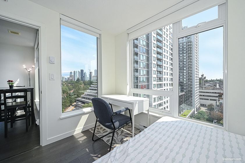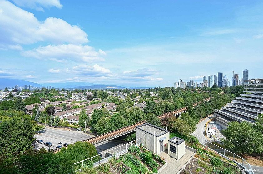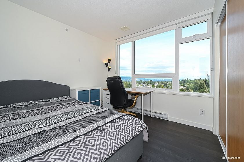 Welcome to Wall Centre Central Park, offering a stunning panoramic view. This Junior two bedroom residence features a spacious bedroom and living room, another bedroom or Den measuring 8 by 8'3 feet with windows.The modern design boasts custom cabinetry, integrated refrigerator, stainless steel appliances, gas range, quartz countertops, and laminate flooring. Amenities include a fitness center, meeting room, and a rooftop garden. Located steps from Joyce SkyTrain Station, Central Park, Starbucks, and Safeway, with numerous nearby Chinese restaurants, cafés, bakeries, and grocery stores. Just two SkyTrain stops to Metrotown and 16 minutes to downtown. This unit also includes an EV-ready parking stall and a storage locker.