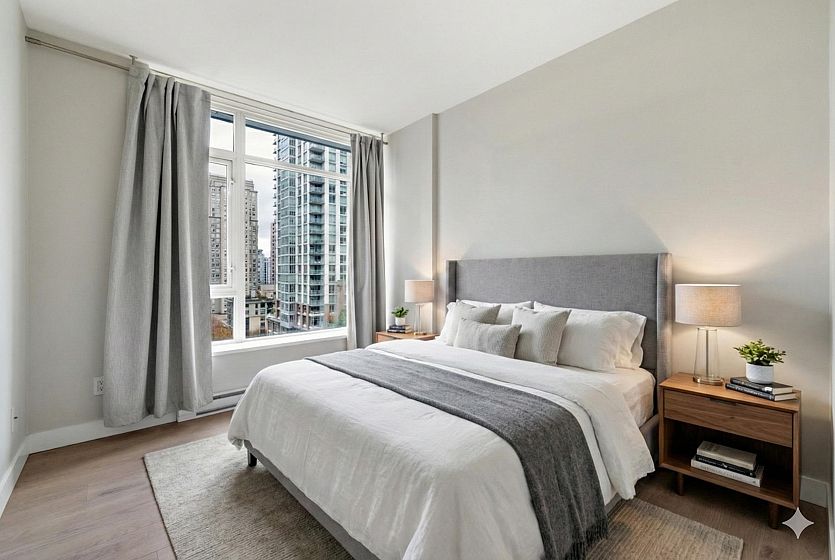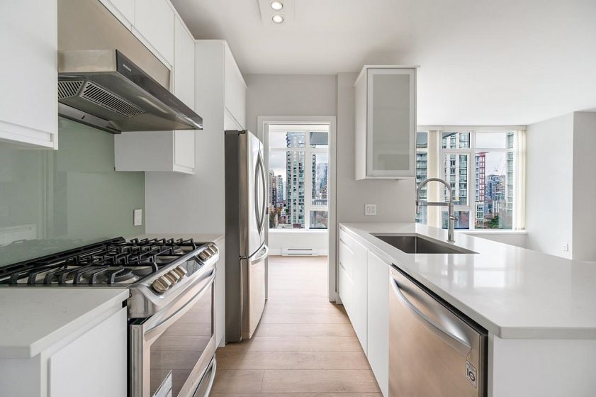 LOCATION! A rare opportunity to invest or to own this 915 SqFt 2b+2b+den+1parking unit at the R&R Building in the heart of Downtown Vancouver. This bright & cozy home features an open concept floorplan with views of the city and future park view! Open kitchen includes granite counter tops, stainless steel appliances, gas stove, & a huge in suite storage. All the great restaurants, coffee shops, shopping & sport entertainment are just steps away. BC Place, Vancouver Public Library, Starbucks, Tractor, Medina & only few mins away from Granville entertainment strip, Pacific Centre, etc.. Don’t miss the chance to live on the most prestige street in Dt Vancouver, “Robson Street”. Wonderful well maintained building with concierge service, very motivated seller, try offer! Open Nov 8&9 (2-4pm)